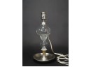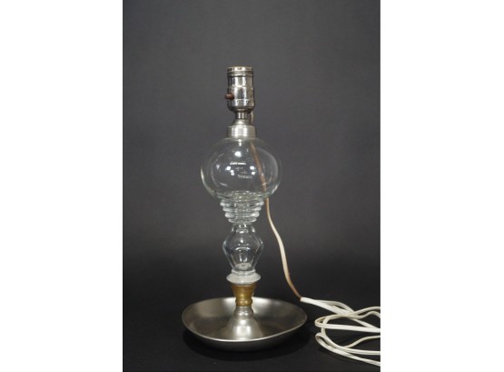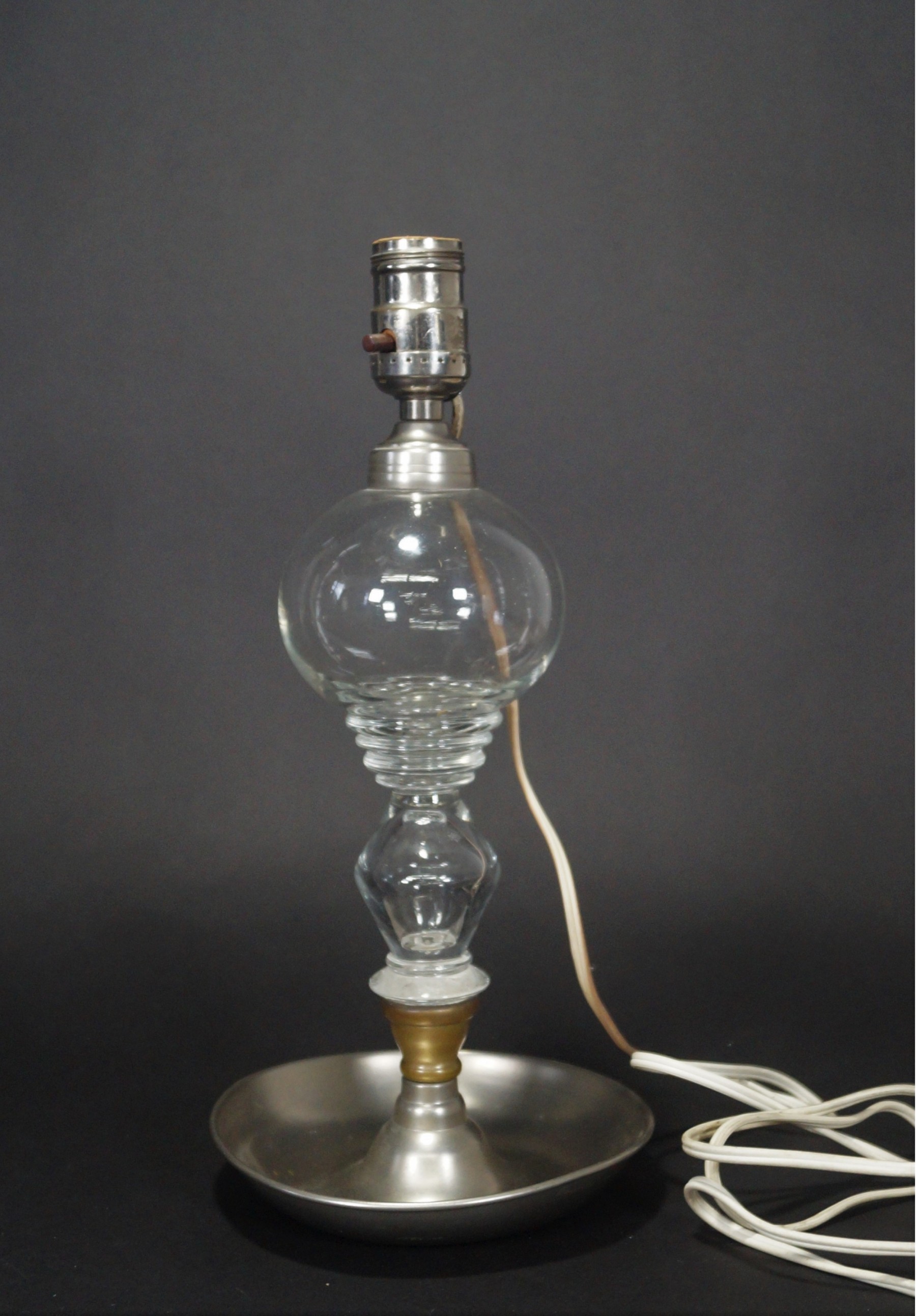 Listed is a table lamp made from an antique oil lamp. It measures 13.25" h to top of socket. The silver tone metal base is slightly bent, but otherwise it is in very good condition and works.