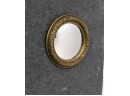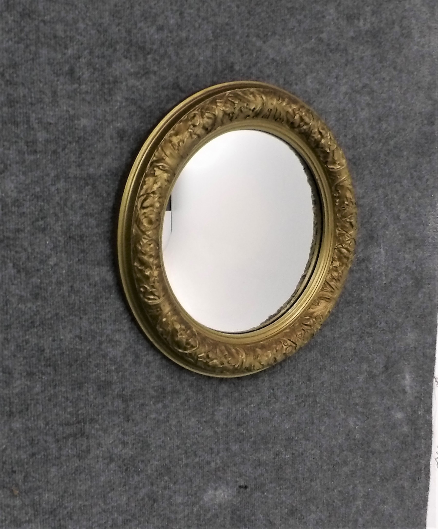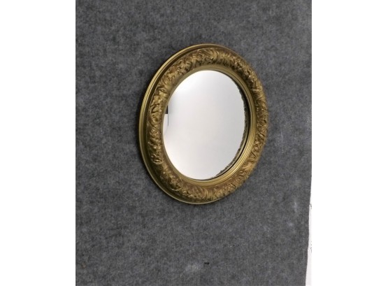 Listed is a vintage convex mirror with a diameter of 16.5". The ornate frame has one little chip and a small patch of discoloration on the mirror surface; otherwise, condition is very good for it's age.