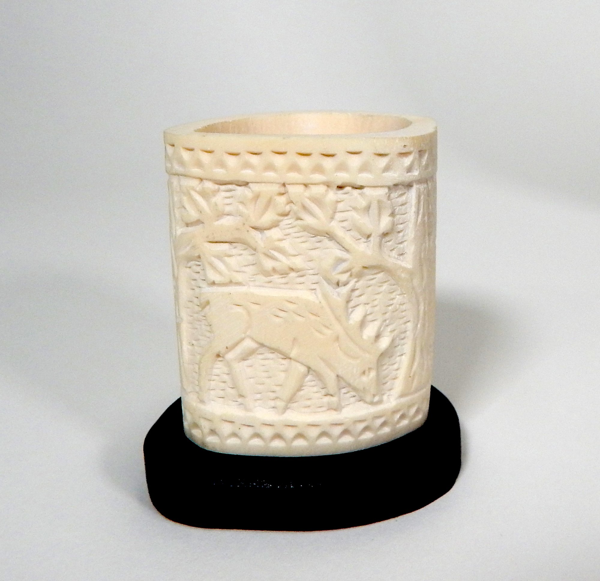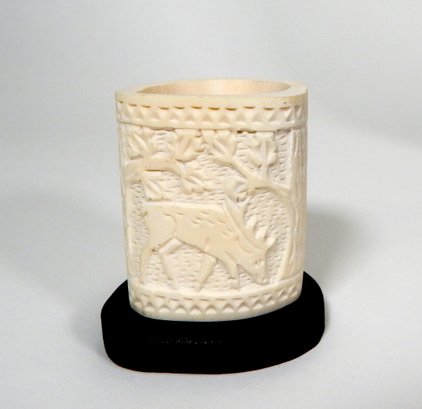 Hand carved tusk with animals on wooden base.