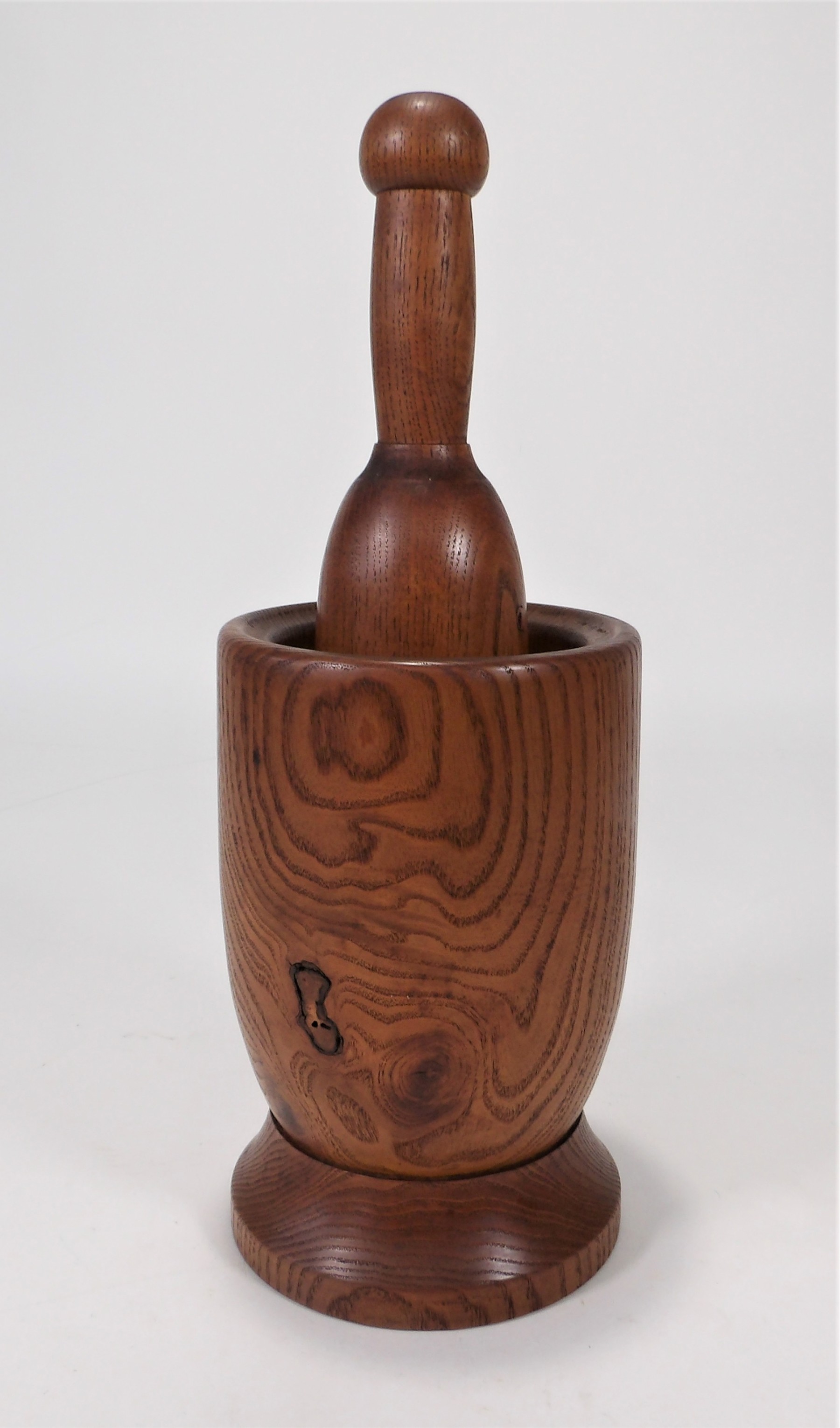This listing is for a mortar and pestle that has inscribed on the bottom "Turned From Mountain Ash Cut In Willsboro, N.Y. - F. R. Morley - 1978". The mortar is 7.75" tall and 5" wide. The pestle is 10.25" tall and 2.5" at the base. The wood is very rich looking with a nice grain throughout. Please see photos for details.