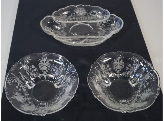 Lovely pair of footed bowls, and a 3-part divided oval dish. Orchid pattern.