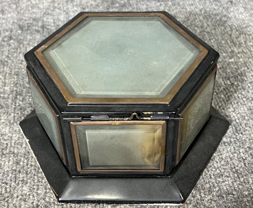 This vintage hexagonal electric fixture has a metal body with frosted glass panels. It was likely used as a ceiling or wall-mounted lamp. The fixture shows signs of wear with visible patina and tarnish on the metal frame. The frosted glass panels have minor staining and discoloration, indicating age.