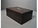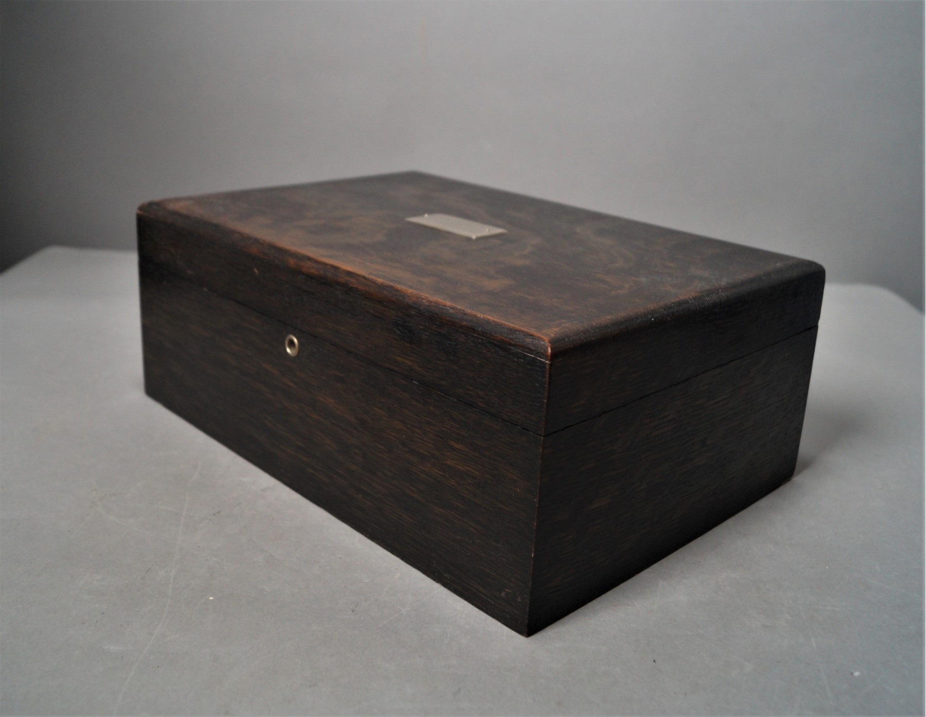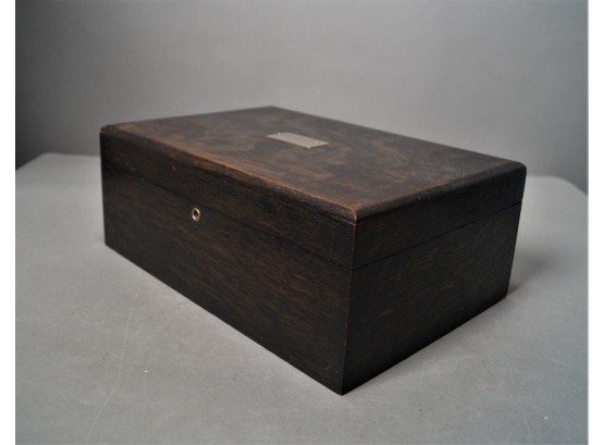 Listed is a vintage humidor. The wood is stained a dark chocolate brown. It measures 4.5"h x 11.75"l x 8"d. In very good vintage condition. The key is missing.