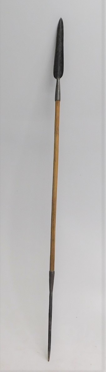 66" tall with iron blade tips. Solid wood handle.