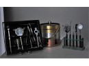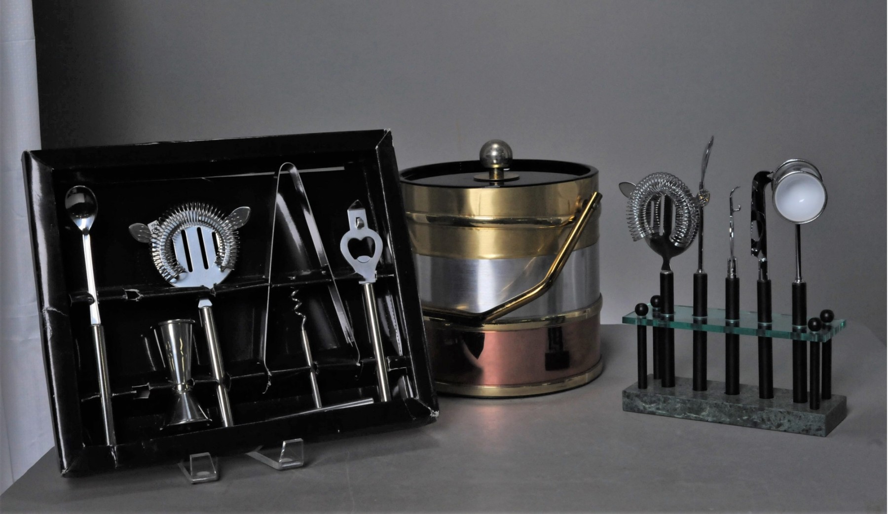 Listed is a vintage c. 1970 Shelton Ware ice bucket measuring 8"h x 8" diameter. It has a smoky plastic lid and body of metal stripes in gold, silver and copper. The knob on the top shows some wear, but otherwise it is in good vintage condition. Also listed are two barware sets, one in a green marble and glass stand, the other in it's original packaging. Both in very good condition.
