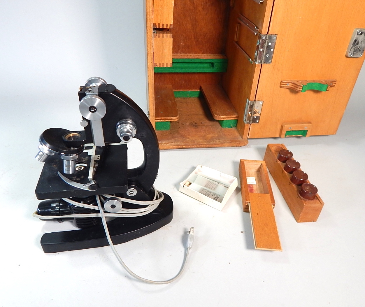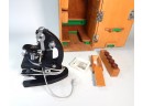 Vintage microscope with wooden box, working light and some accessories.