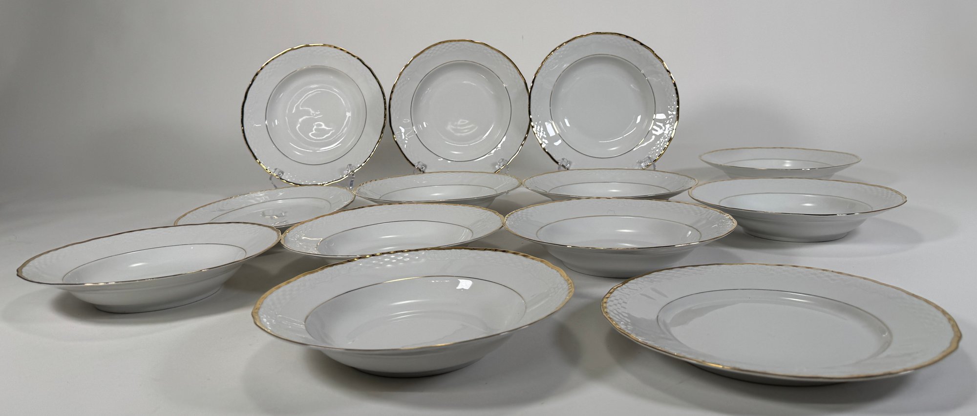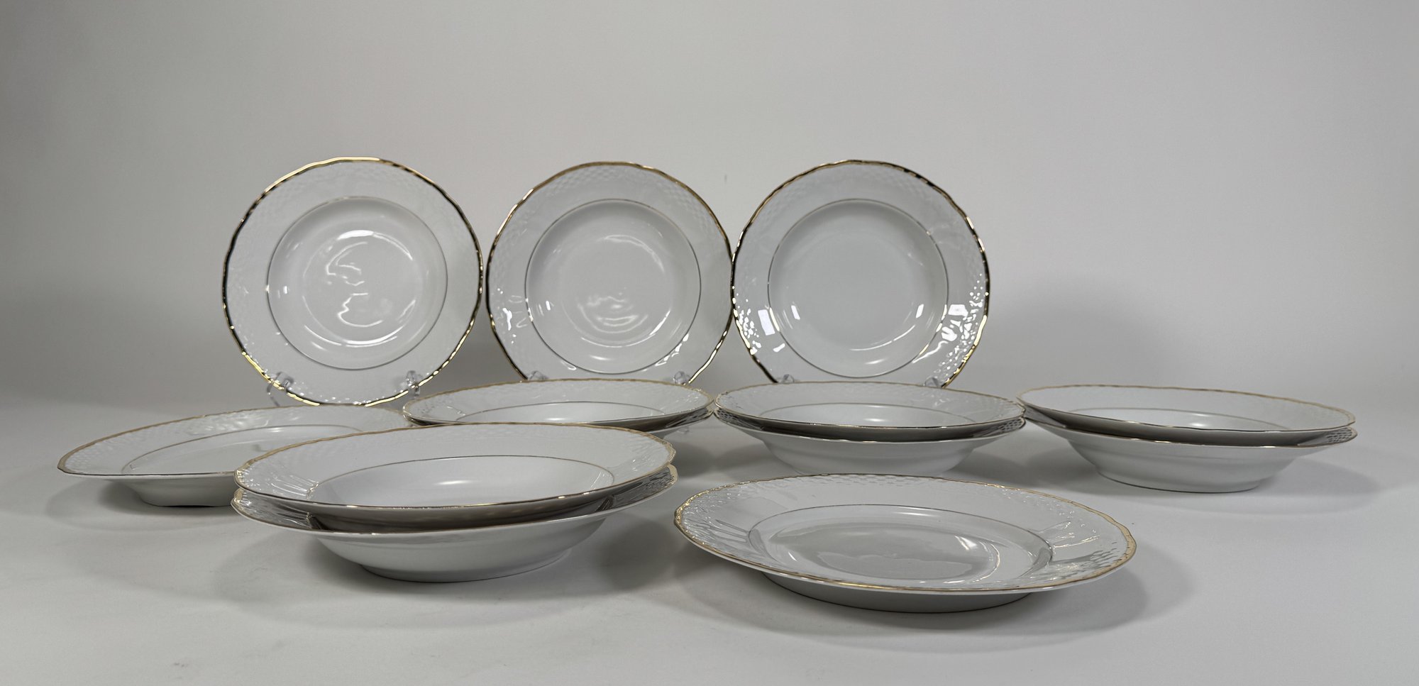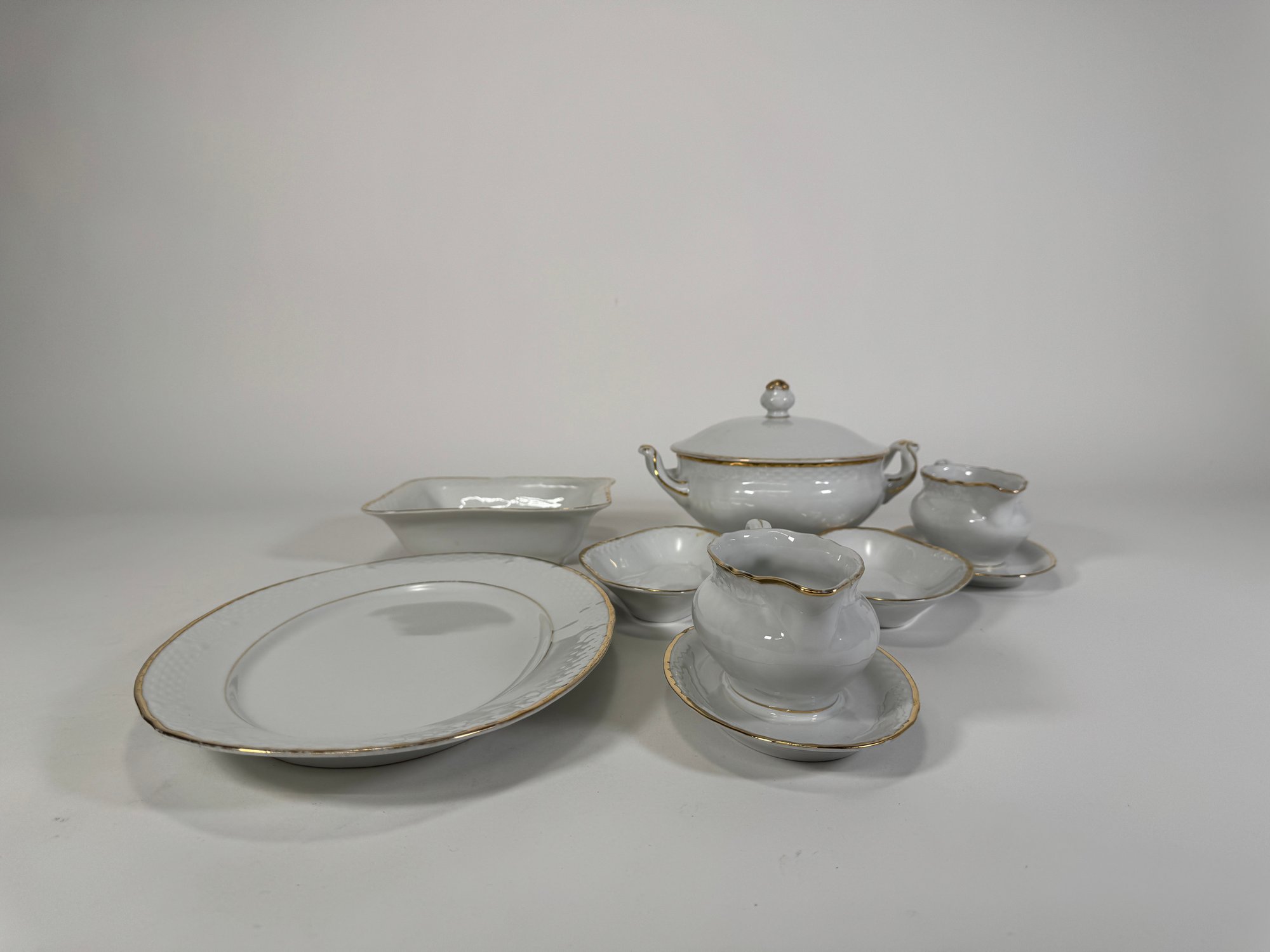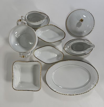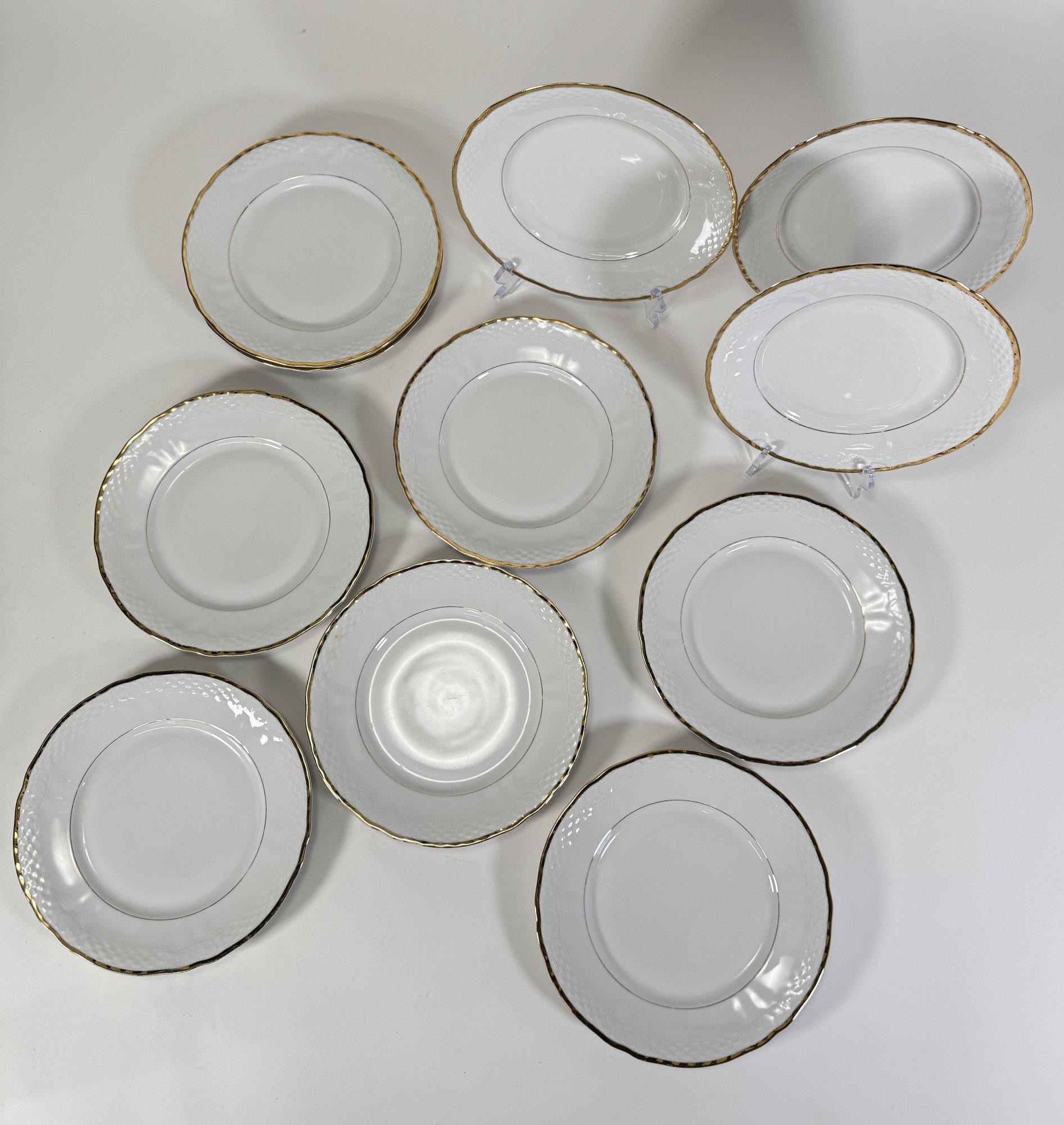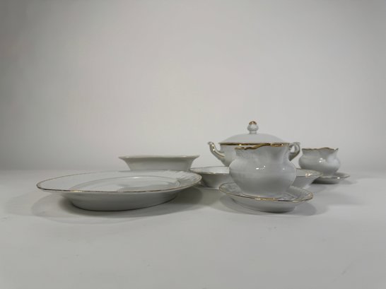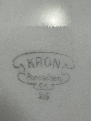 This is a vintage porcelain dinnerware set, featuring a delicate gold trim. The set includes a variety of pieces suitable for a formal dinner setting. The set is marked "Kron PorcelainĀ EK 25".
