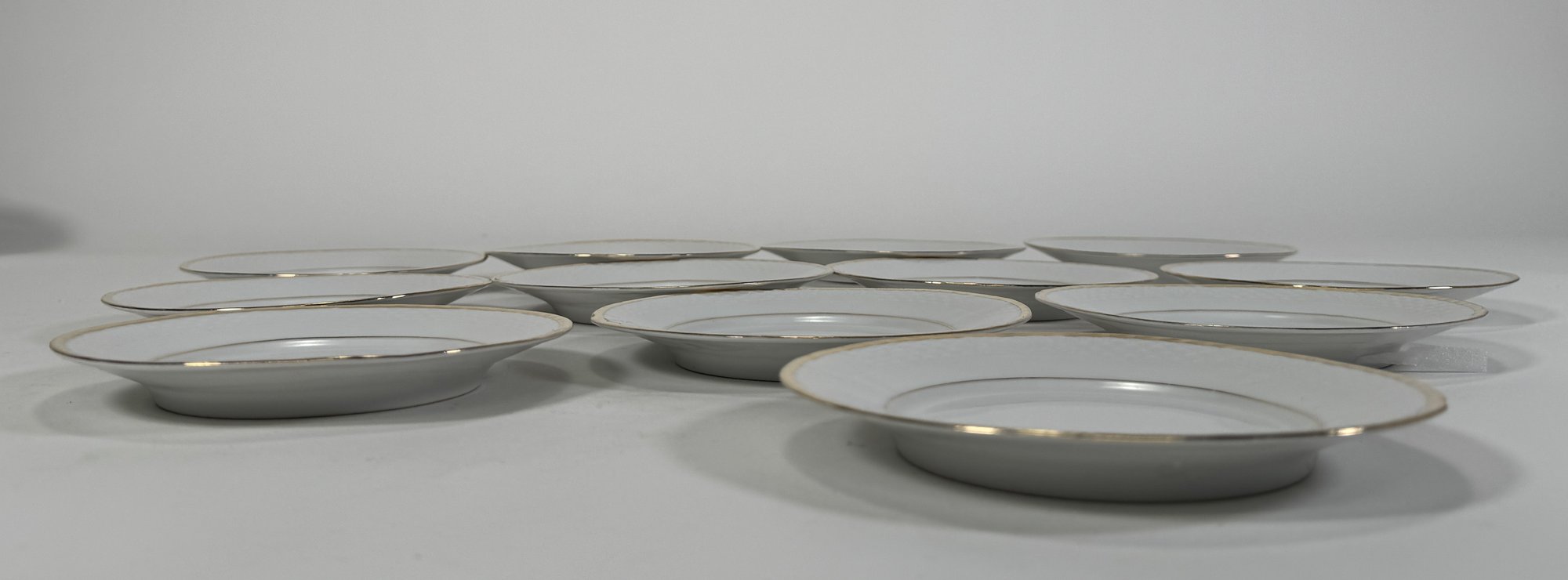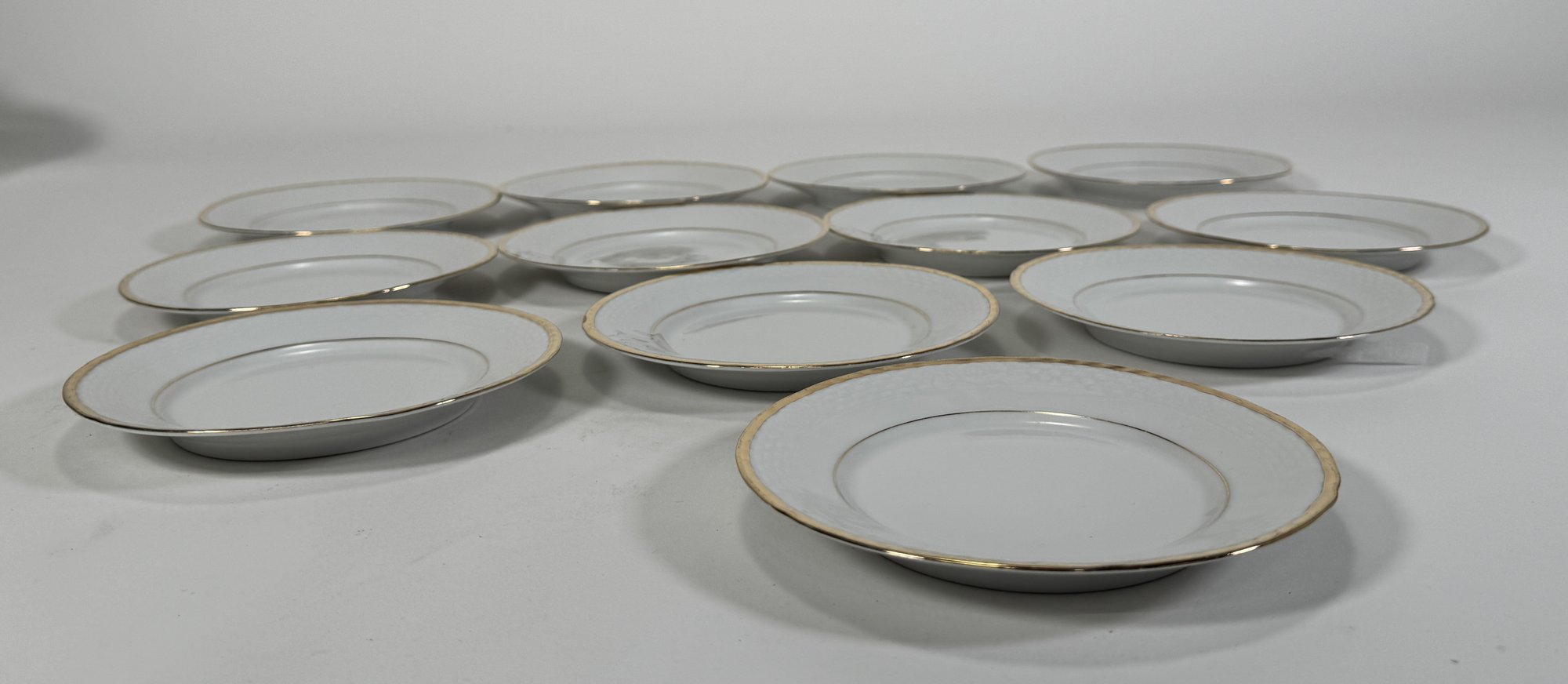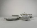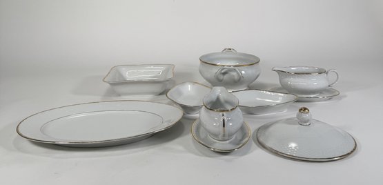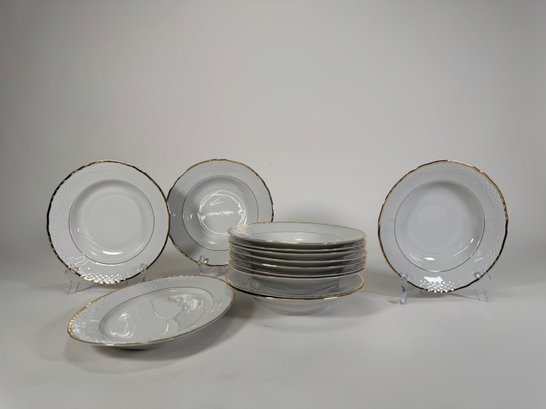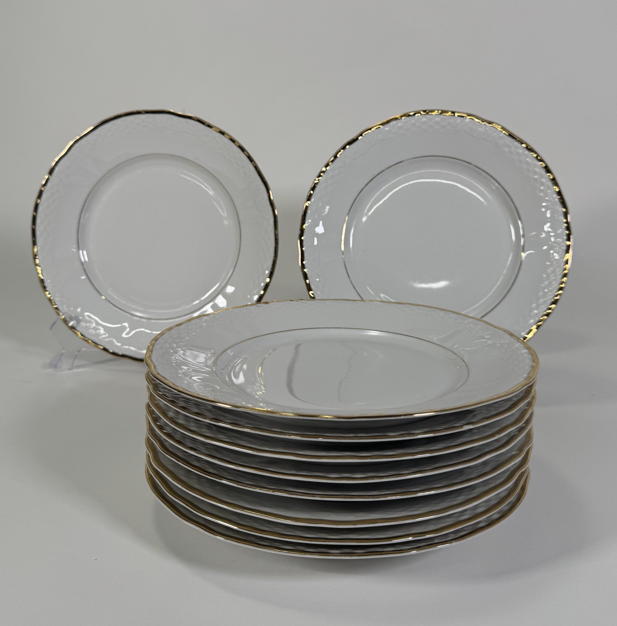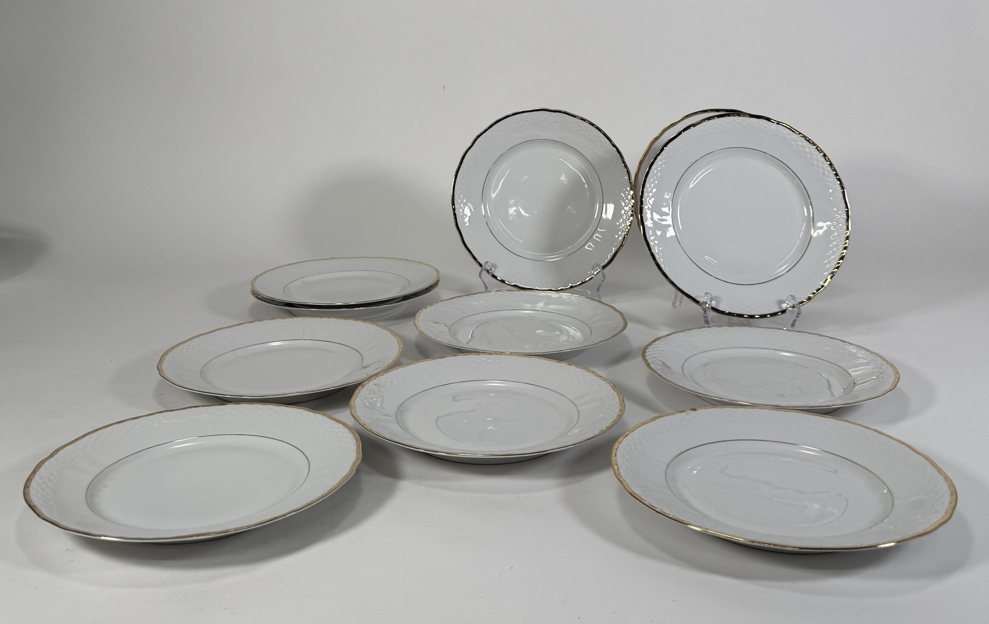 This is a vintage porcelain dinnerware set, featuring a delicate gold trim. The set includes a variety of pieces suitable for a formal dinner setting. The set is marked "Kron PorcelainĀ EK 25".