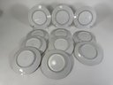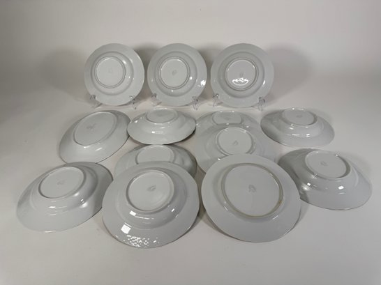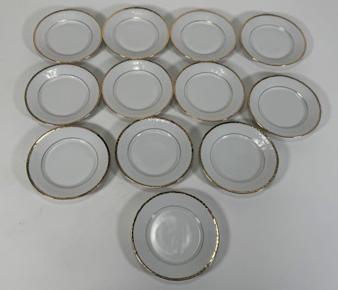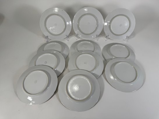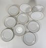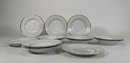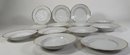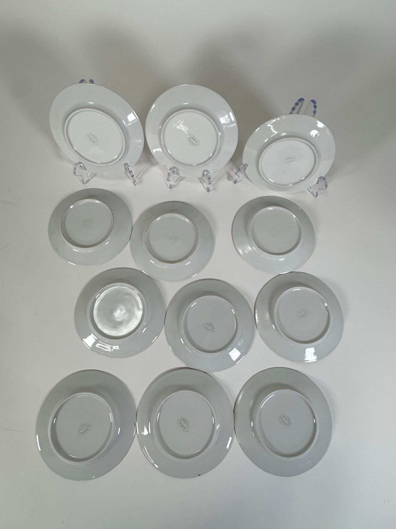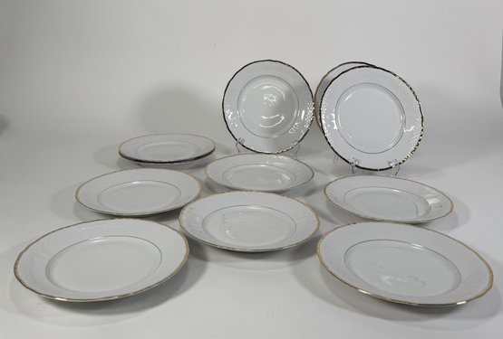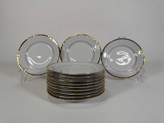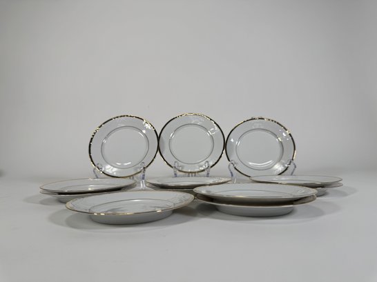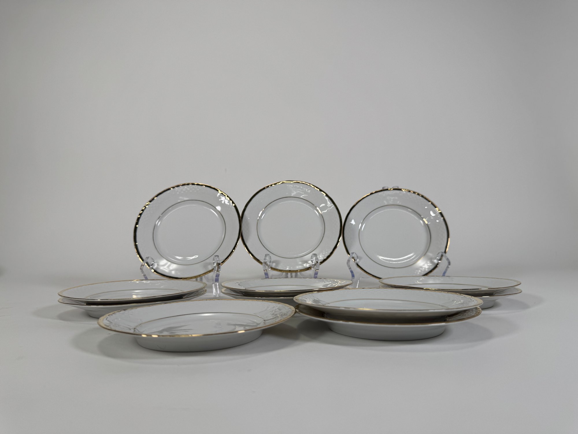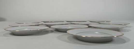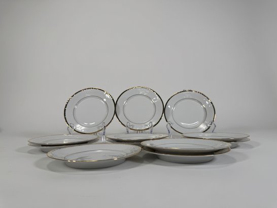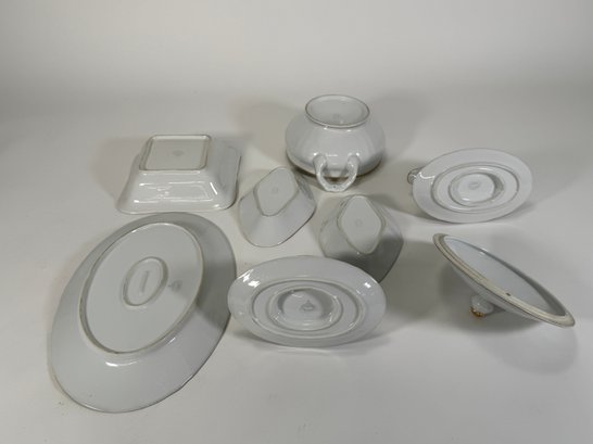 This is a vintage porcelain dinnerware set, featuring a delicate gold trim. The set includes a variety of pieces suitable for a formal dinner setting. The set is marked "Kron PorcelainĀ EK 25".