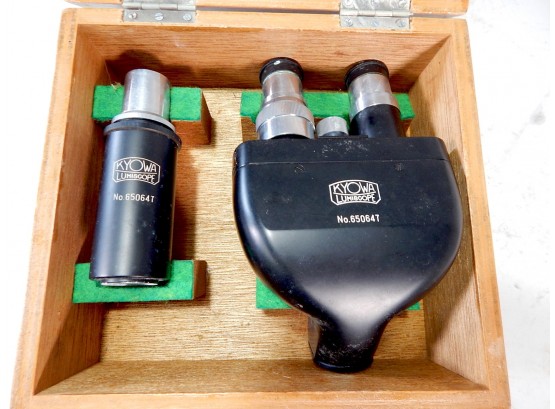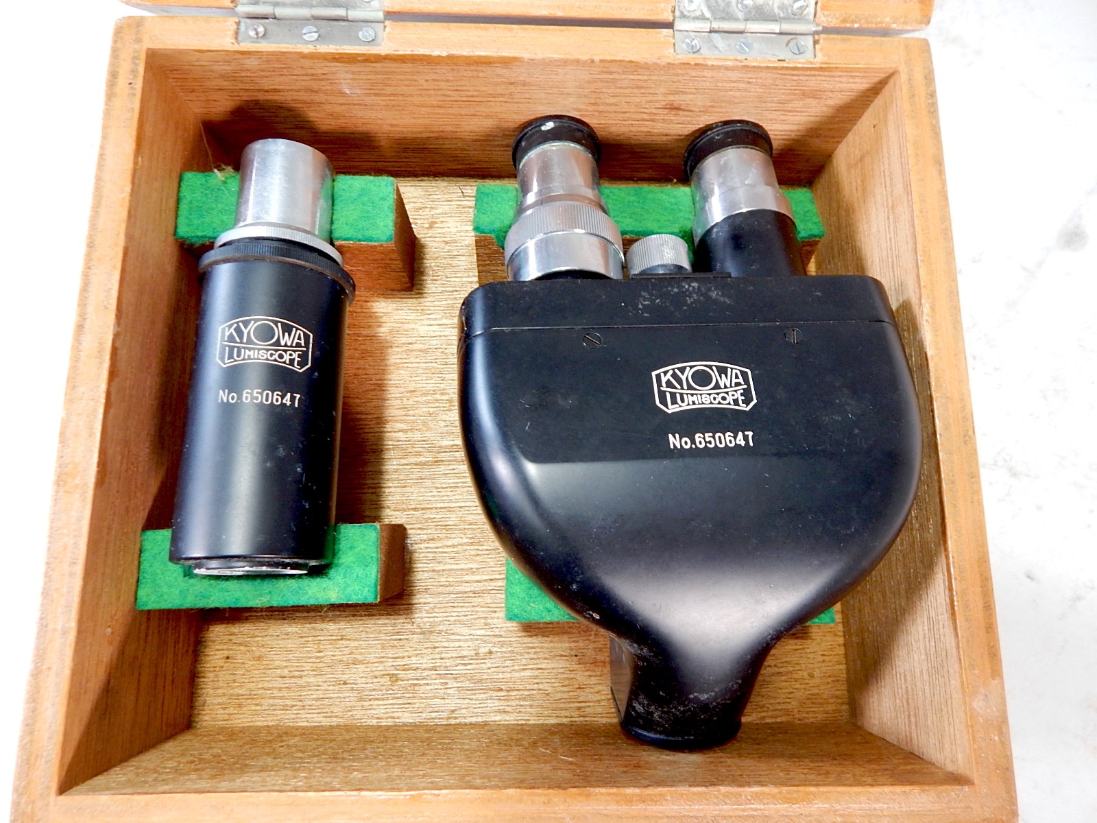 Vintage lens set for Kyowa Lumiscope Microscope with wooden box.
