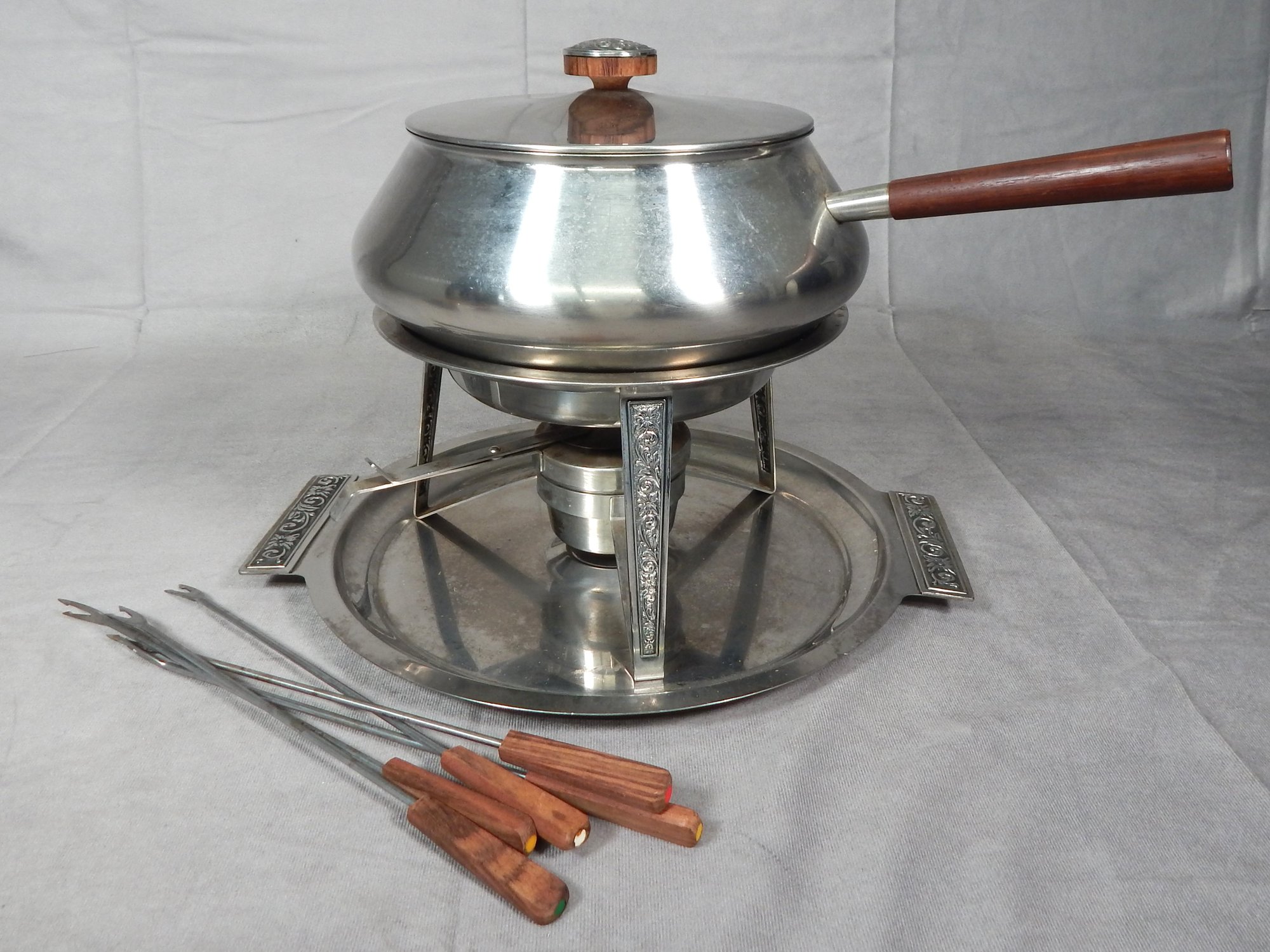 Wonderful stainless steel fondue pot by International Decorator is complete with all parts and six color coded forks