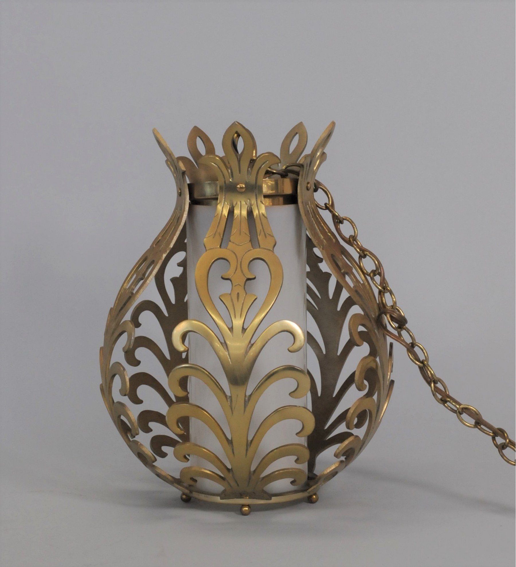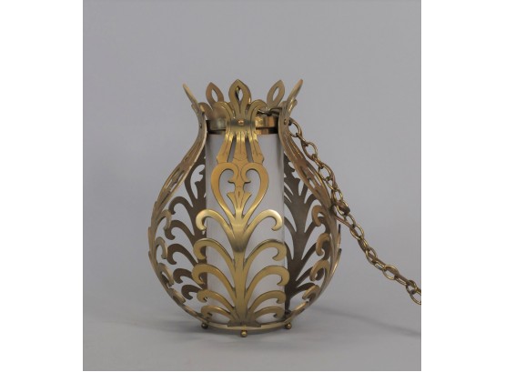 Listed is a vintage hanging light of solid brass. It has a milk glass interior cylinder shade. The chain measures approx. 78" long and the cord has a manual on/off switch. It measures 12.5"h x approx. 9" diameter. It is in working order, however, the cord is original and should be replaced for safety. See photos.