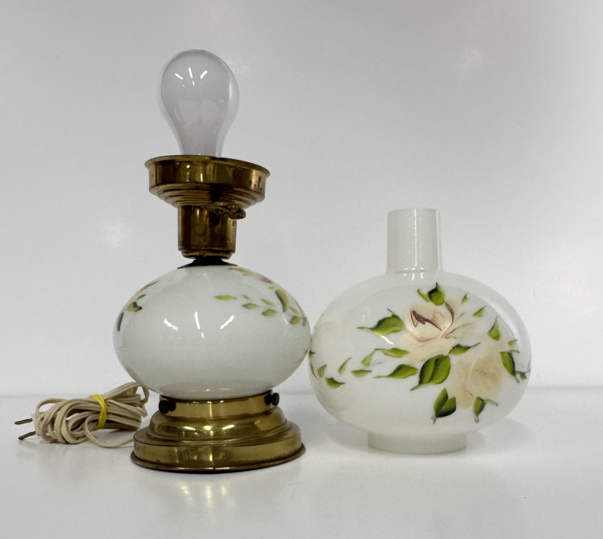 Vintage hand-painted milk glass lamp with brass base. Features a floral design of roses.
