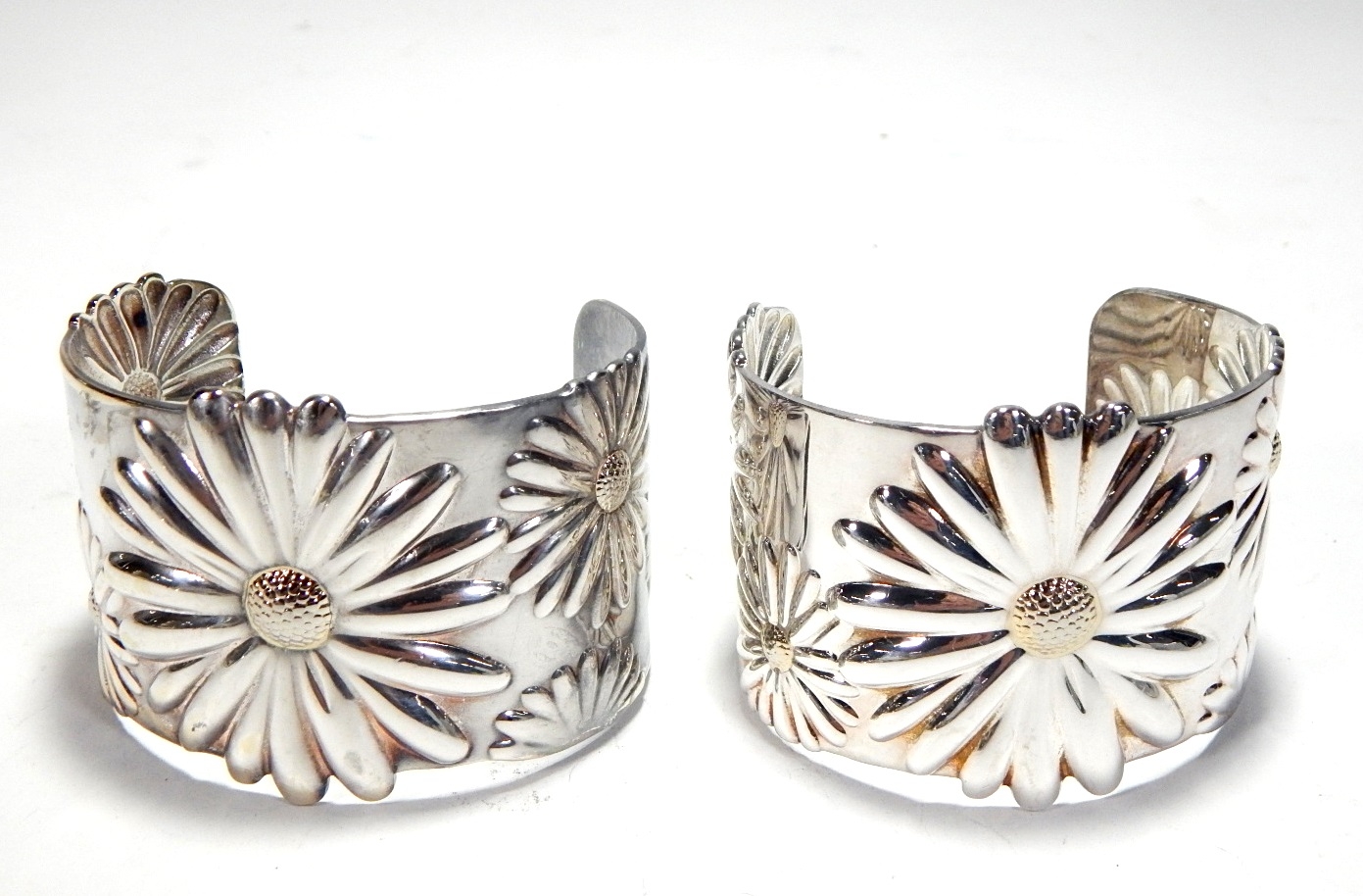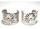 Pair of beautiful wide sterling silver flower cuff bracelets.