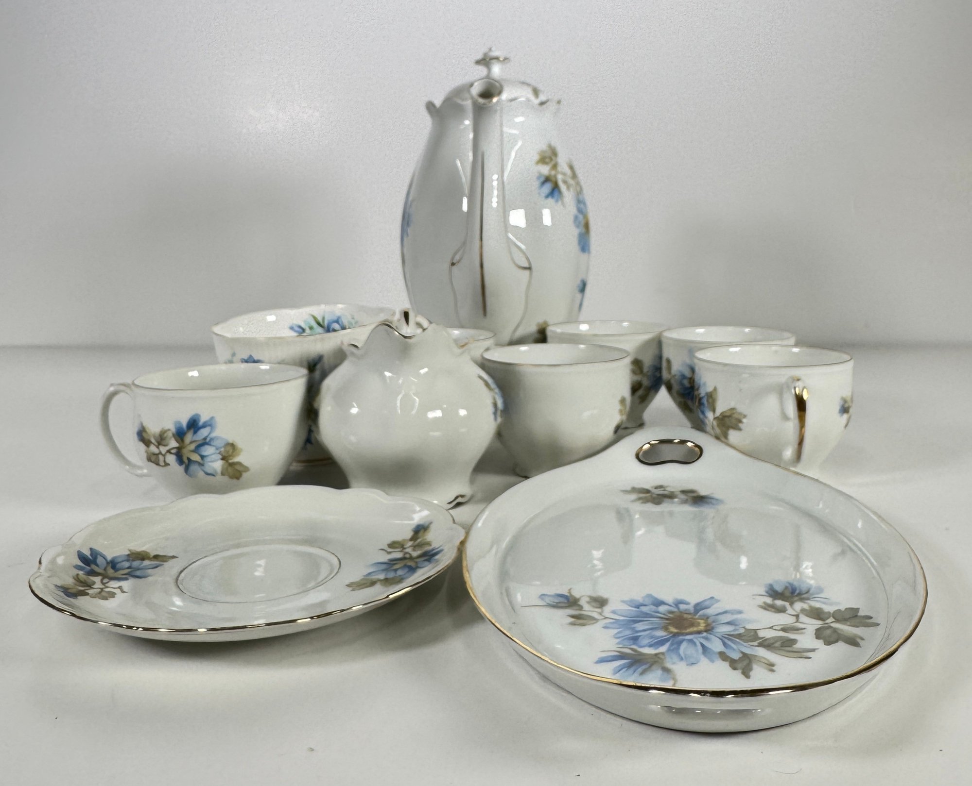 Vintage porcelain tea set with blue floral motif. Includes teapot, creamer, sugar bowl, four cups, four saucers, and a serving tray.