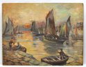 Original oil painting on artist board of sailboats at sunset.