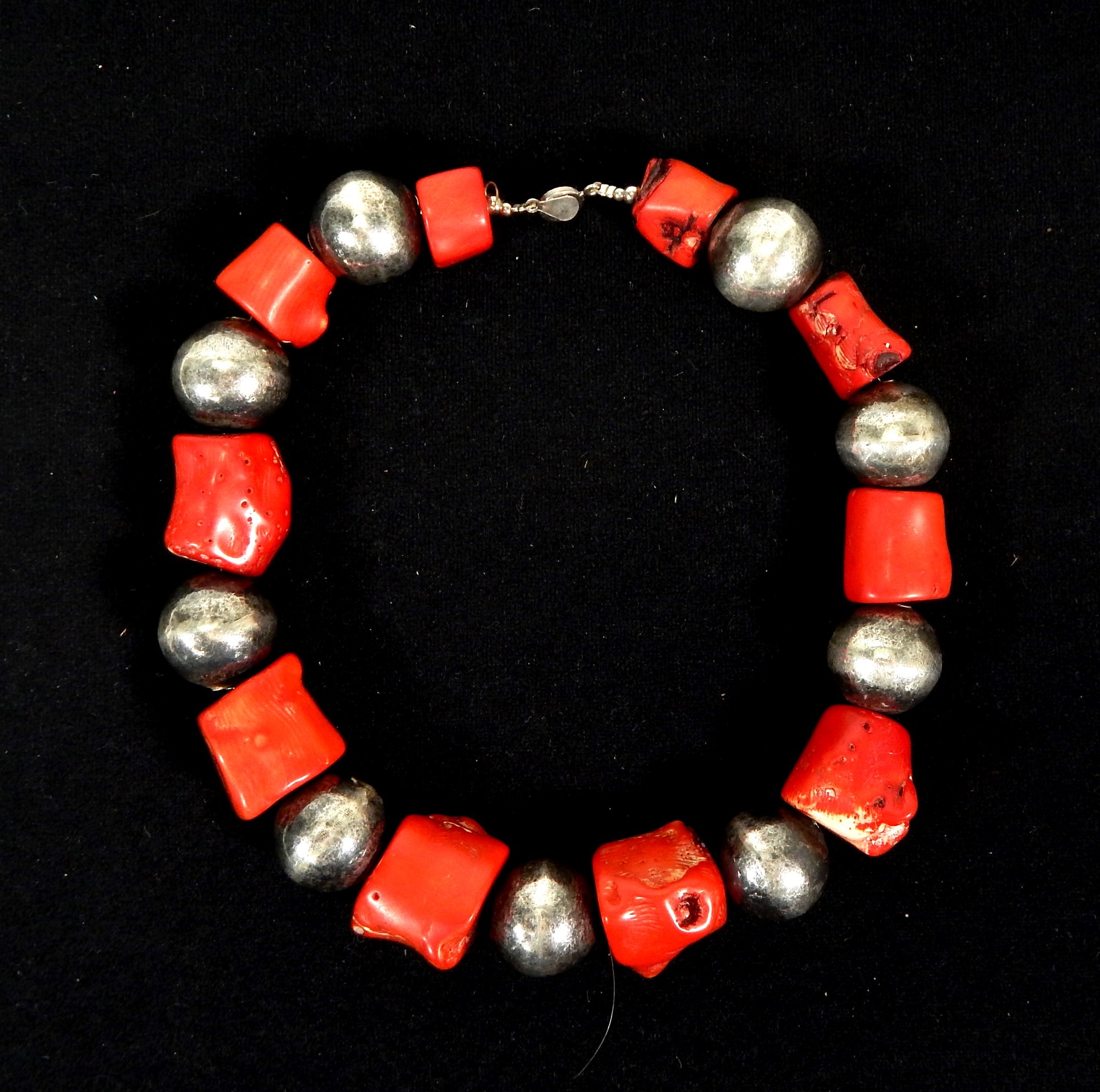 Heavy silver and rough cut coral choker necklace.