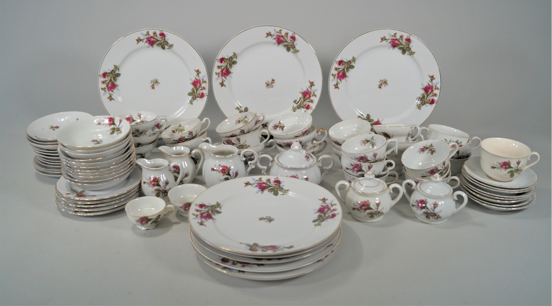 Listed are as follows: Vintage Royal Rose pattern china made in Japan 1944-1950. The pieces all have the same floral pattern, however it appears they may come from a few different manufacturers because the shape and style vary a bit as do the maker's marks. Condition is overall good, however there are a few pieces that are chipped. Please see photos for details.
