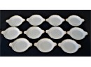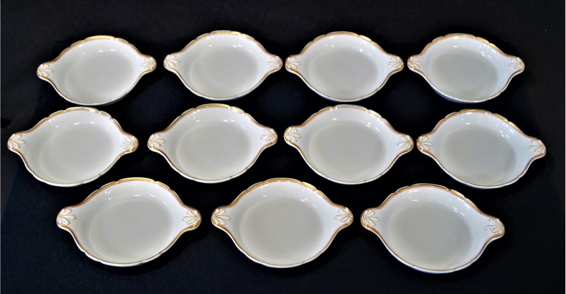 Listed is a lovely set of 11 vintage limoges creme brulee ramekins featuring gold banding with a thin red accent trim. Marked on bottom. They measure 6"l x 4.5"w. In great vintage condition with no cracks, chips or crazing.