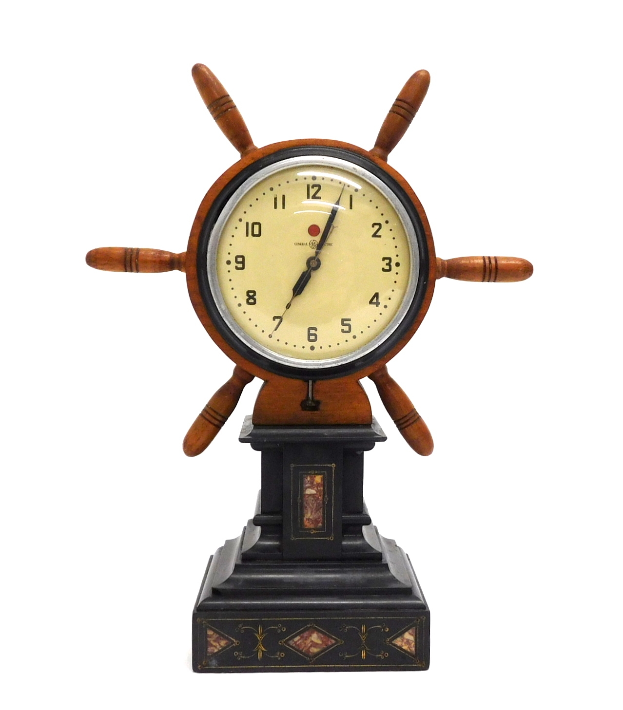Nautical ships wheel electric clock by General Electric with inlayed marble base.