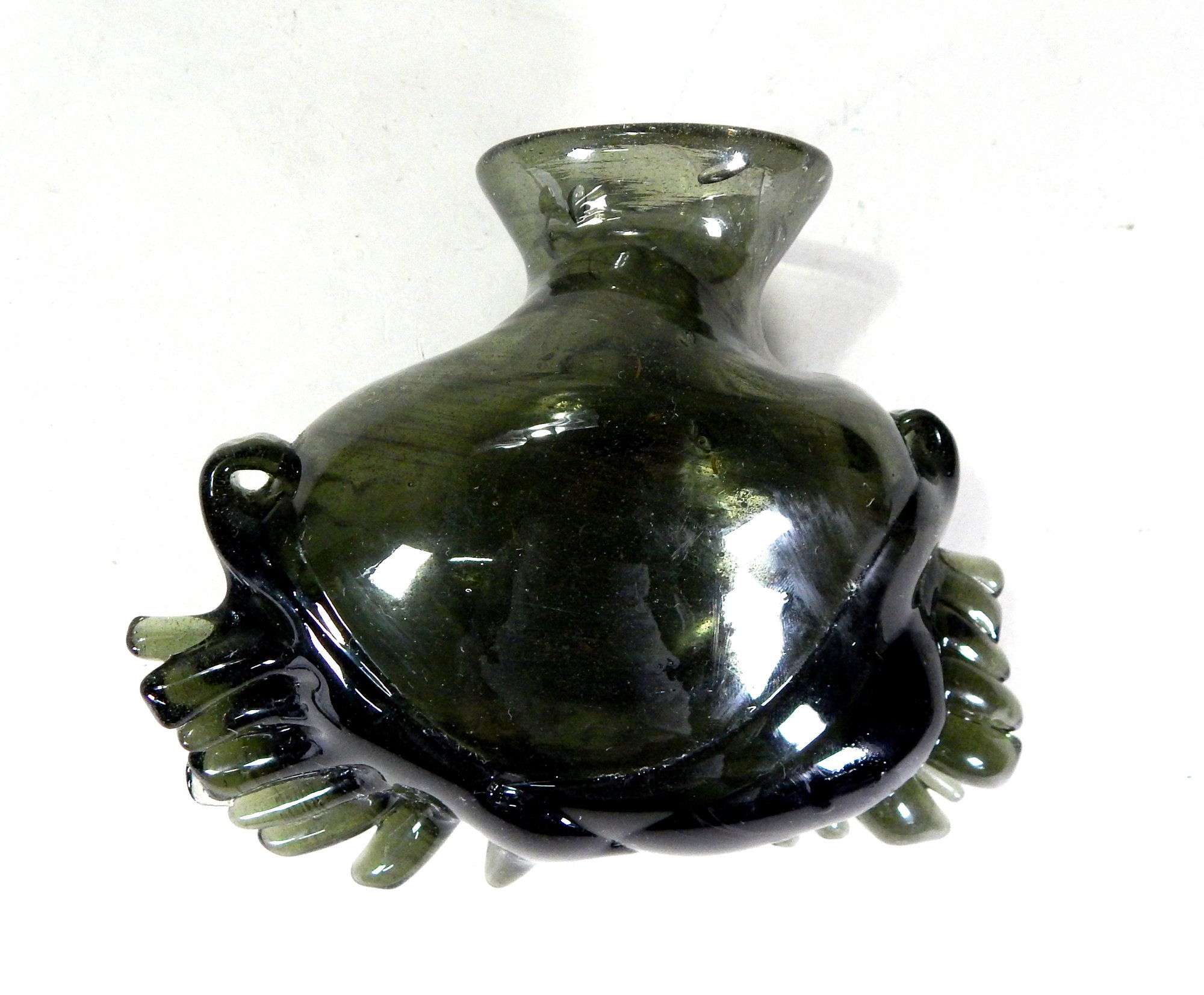 Green glass with trapped bubbles.