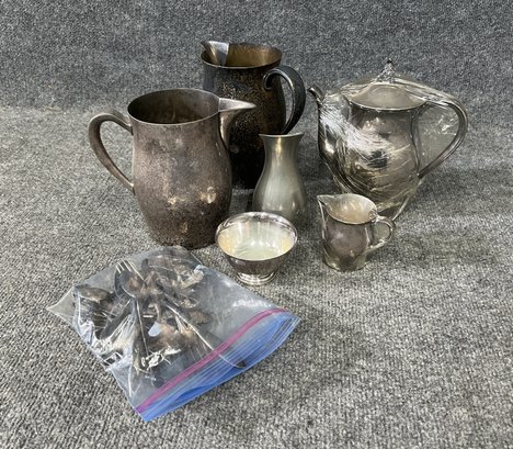 A collection of vintage silver-plated and pewter tableware. The lot includes several pitchers, bowls, dishes, and a creamer, along with a small bag of spoons and forks. The pewter pieces are marked with the Accent on Pewter maker's mark. The tallest item measures approximately 9 inches.