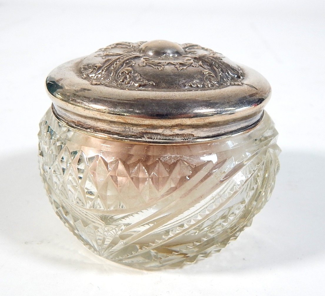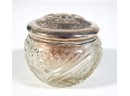 Vintage crystal powder jar with puff, marked sterling silver floral repousse lid.