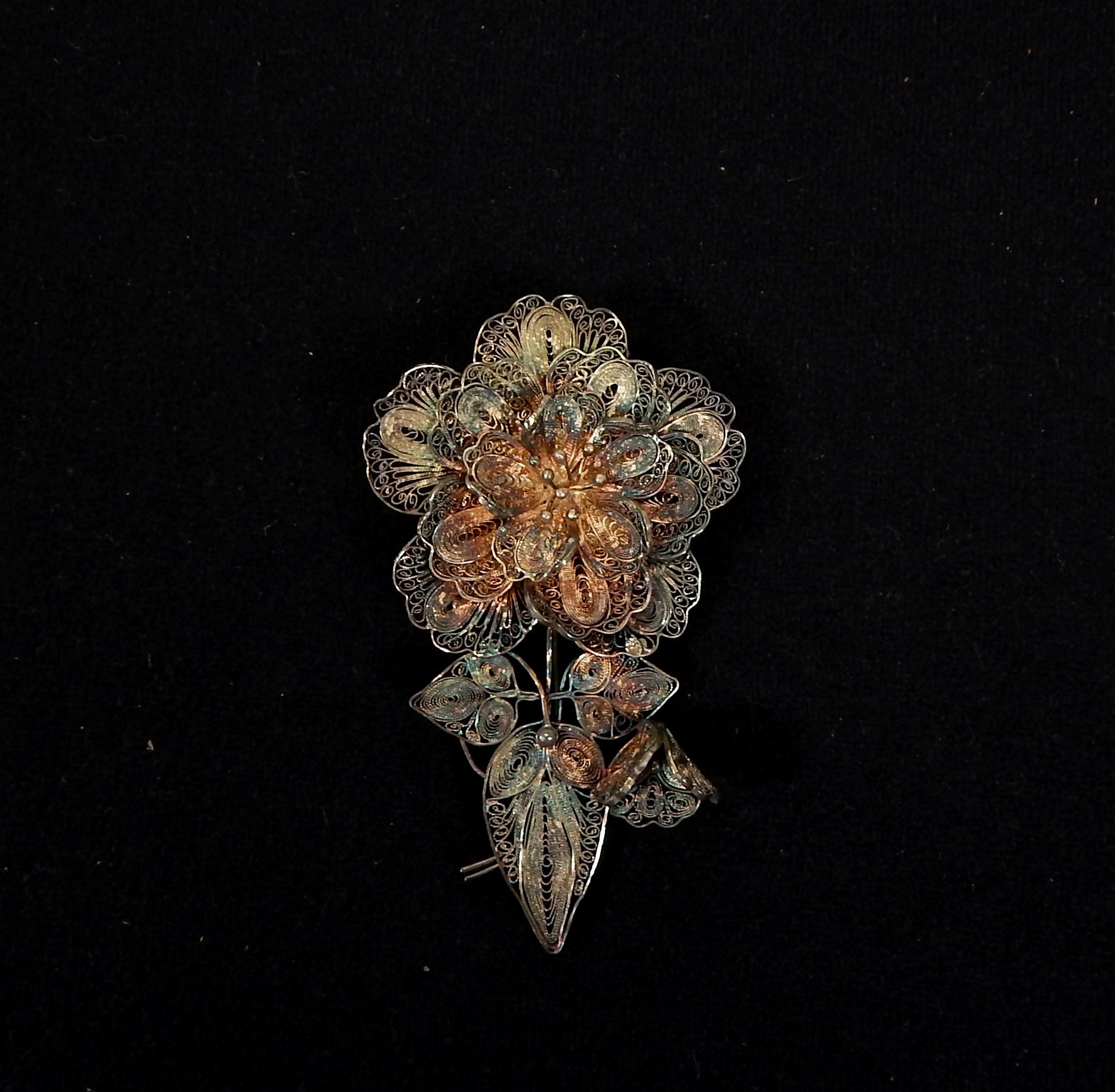 Sterling silver filigree flower brooch.