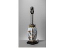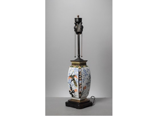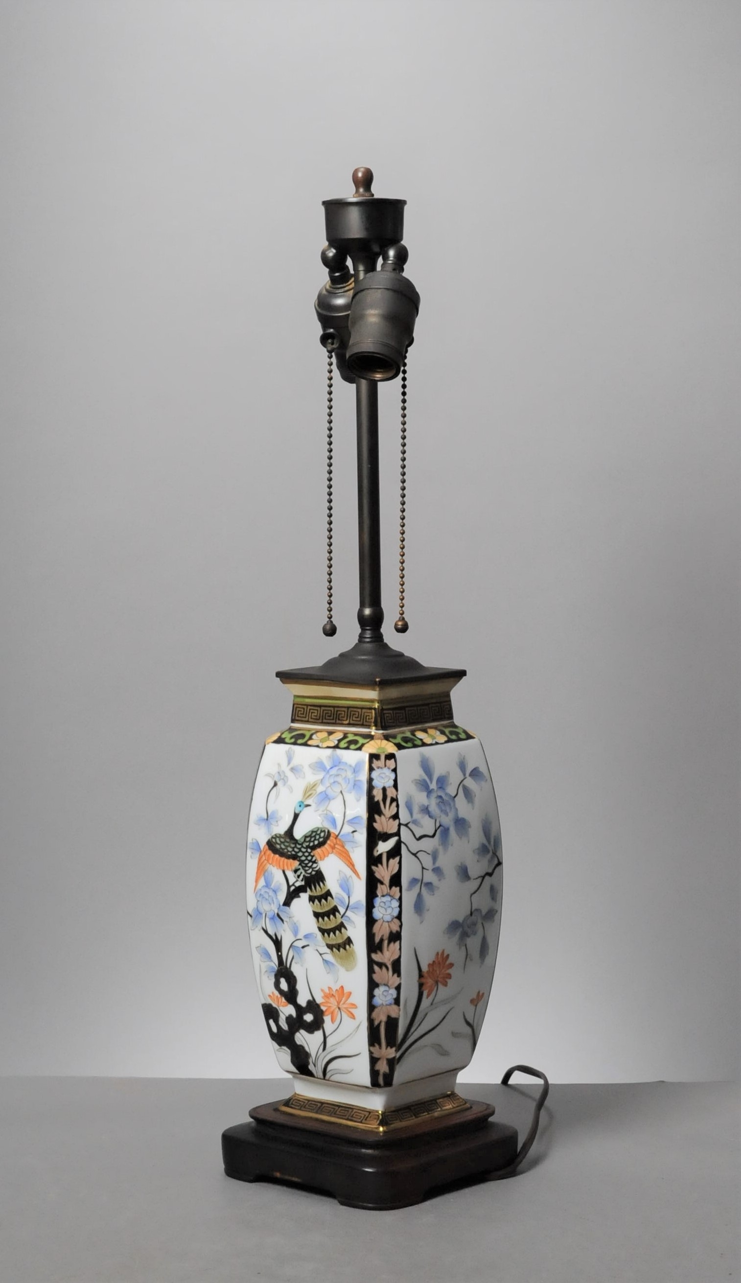 Listed is a lovely table lamp made from a vintage ceramic vase with exotic bird motifs and a Greek key border on top and bottom. Wonderful old sockets with chains. It measures 11.5" to top of base and 23"h to top of finial. The wood base measures 5.5" square. It is in very good condition and the sockets work fine, however, the cord has been repaired and it needs to be replaced for safety. See photos.