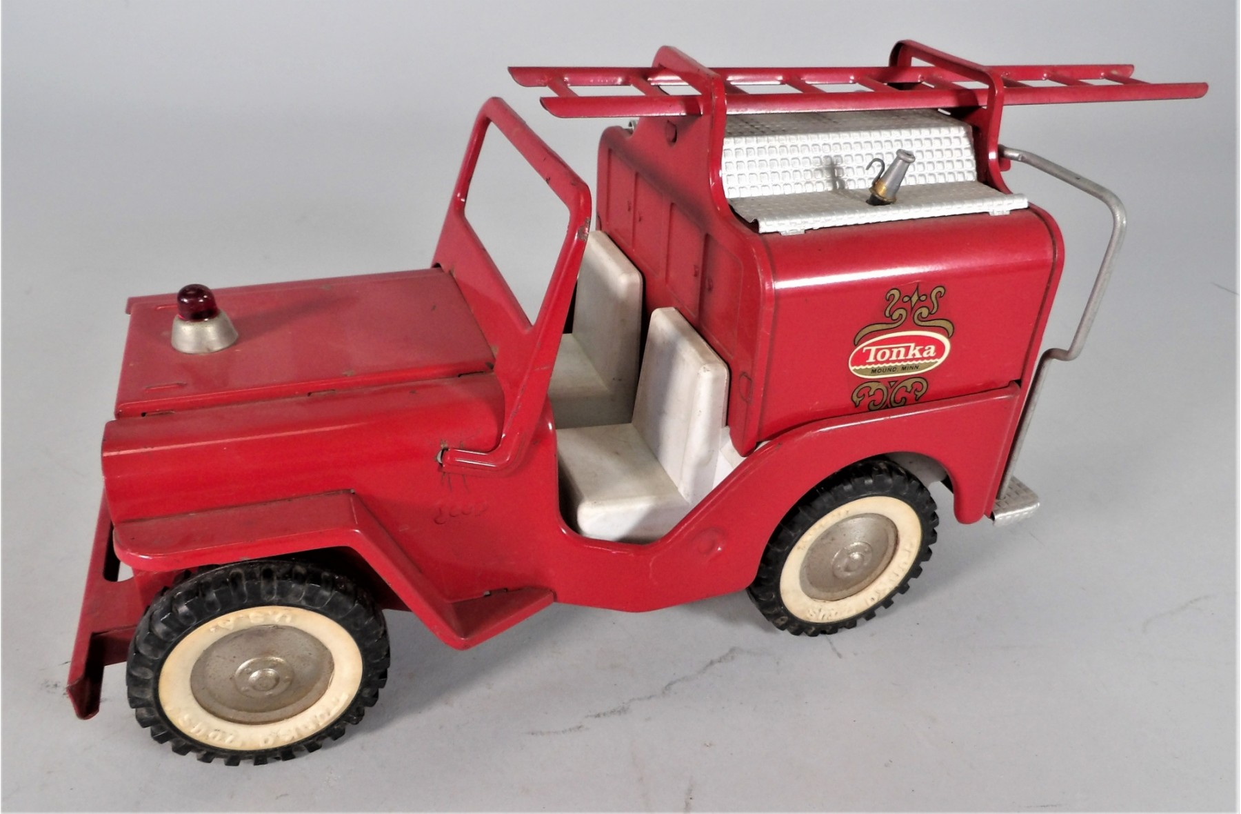 Listed is a red Tonka jeep firetruck measuring 13"l x 5.5"w x 6"h. There is minimal paint loss and this jeep is in very good used condition. See photos for details.