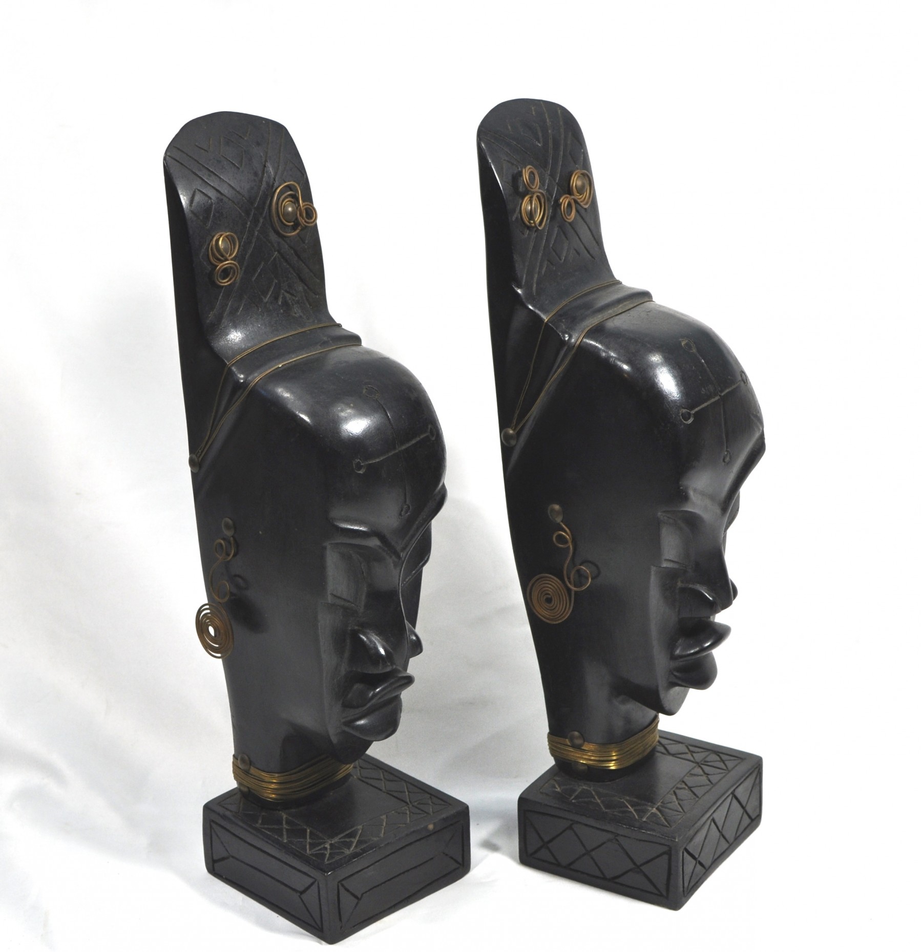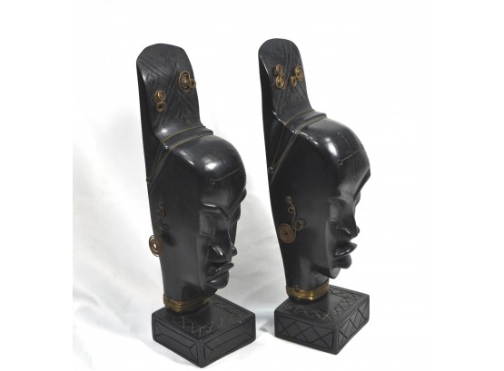Wood carved bookends women busts decorated with metal wire ornaments.