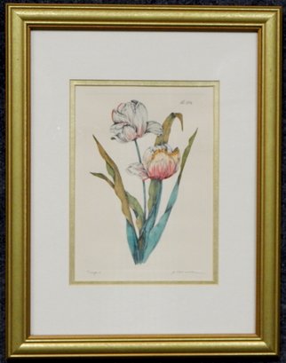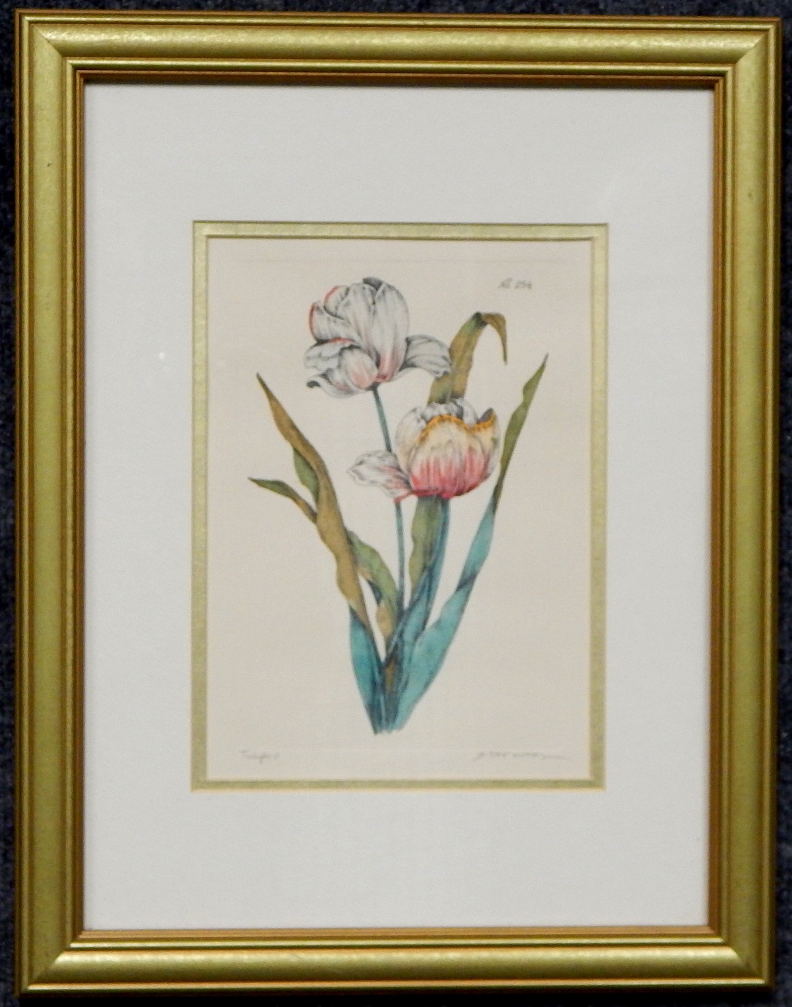 Mated and framed vintage color engraving of tulips.