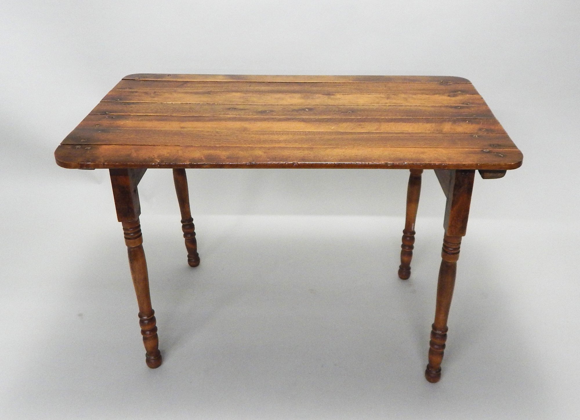 Solid wood bed tray. Top is tongue & groove construction. Legs fold out with a spring loaded mechanism.