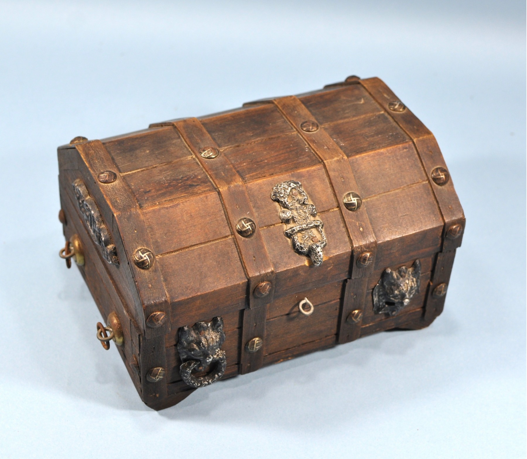 Vintage jewelry box made of wood with metal hardware.