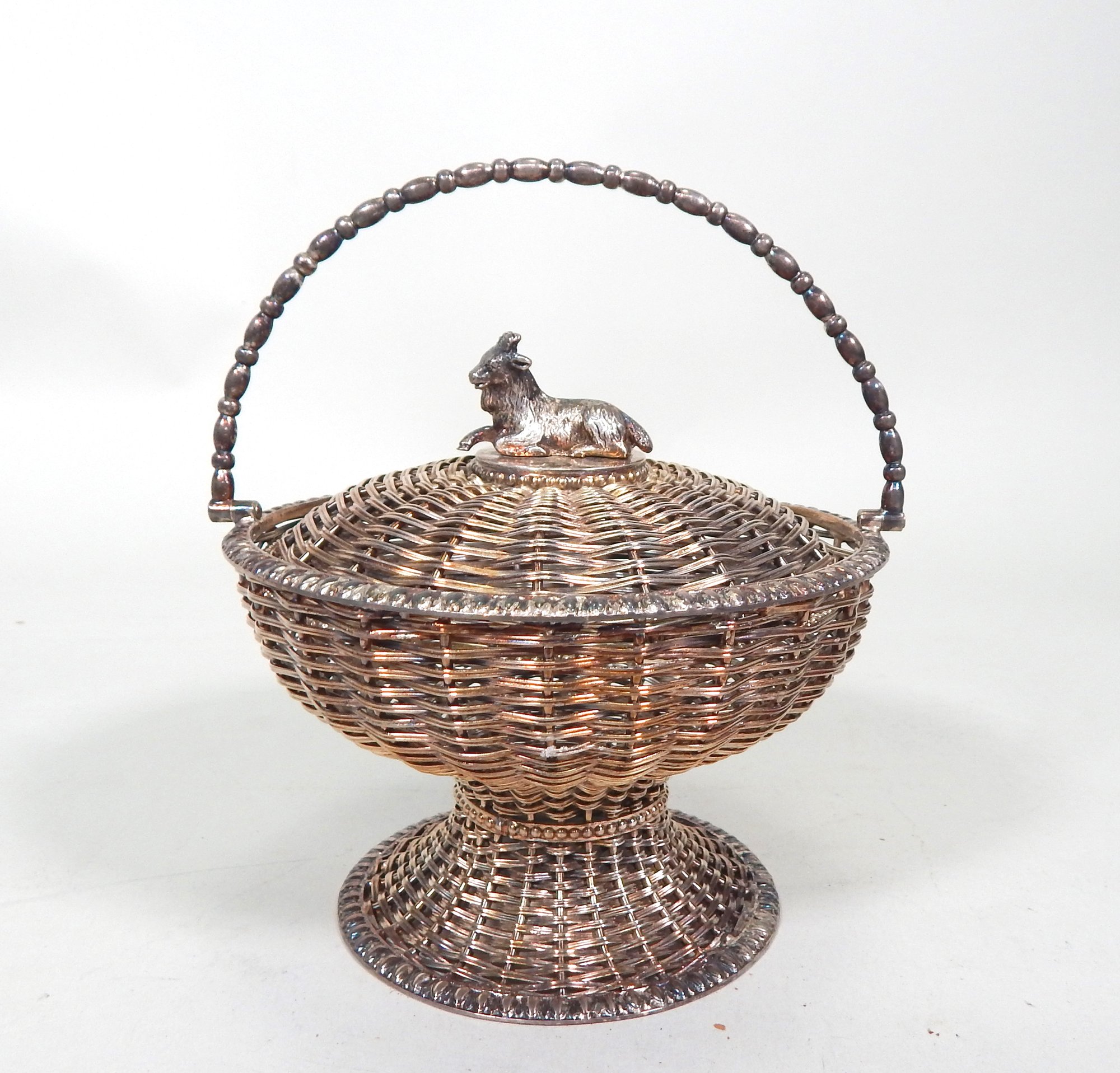 Silver plated scroll feet wire basket with goat figure on the lid.
