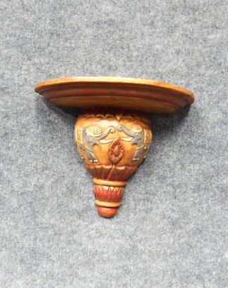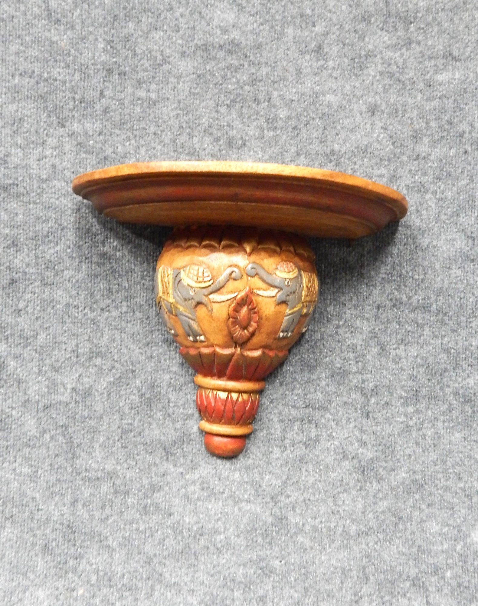Wall pedestal measuring: 15" -widest part of platform x 7"d x 11.75"h. Two beautifully carved and painted elephants. Small chip in wood at bottom right, otherwise condition is very good.
