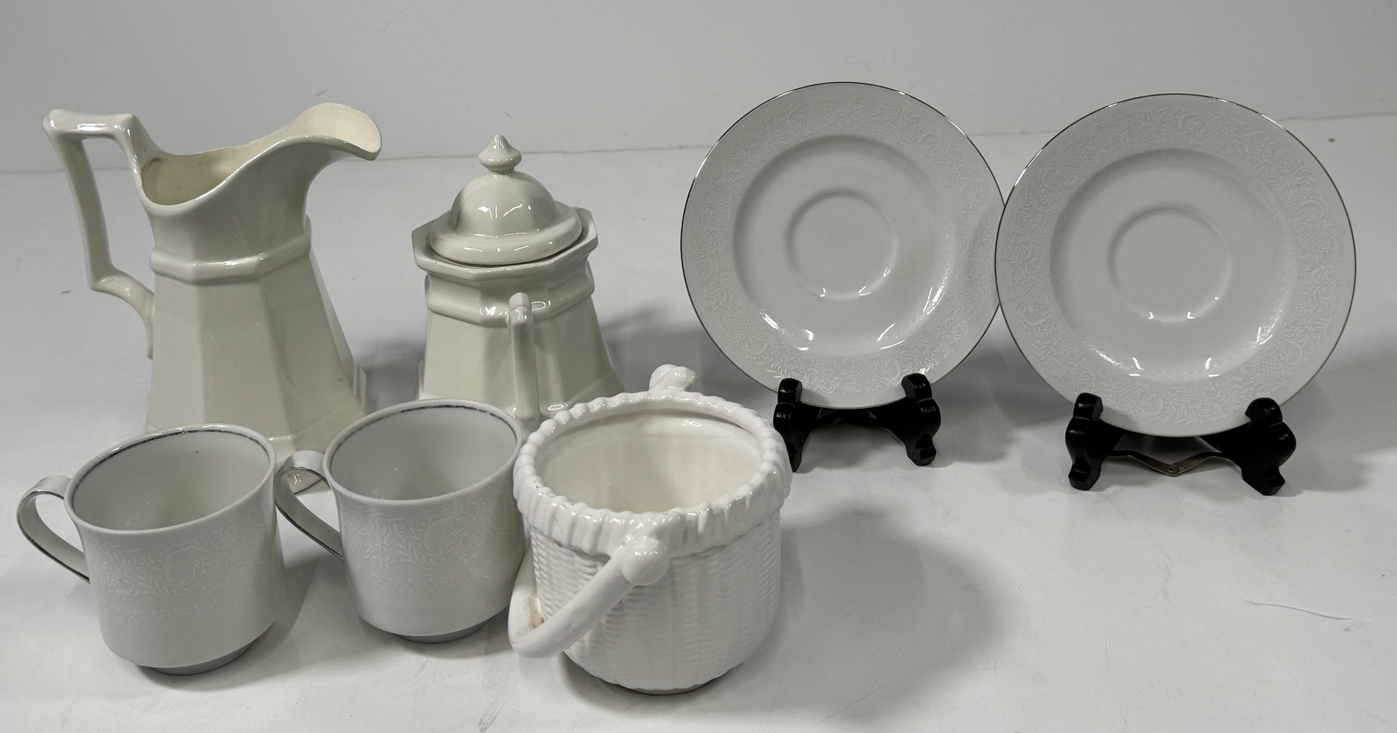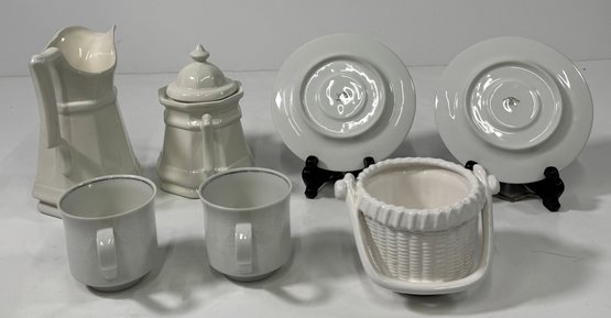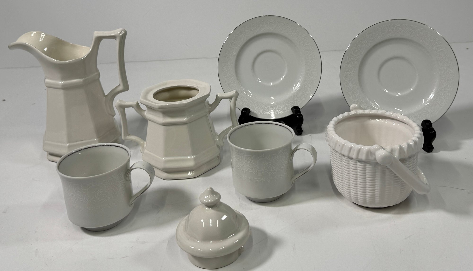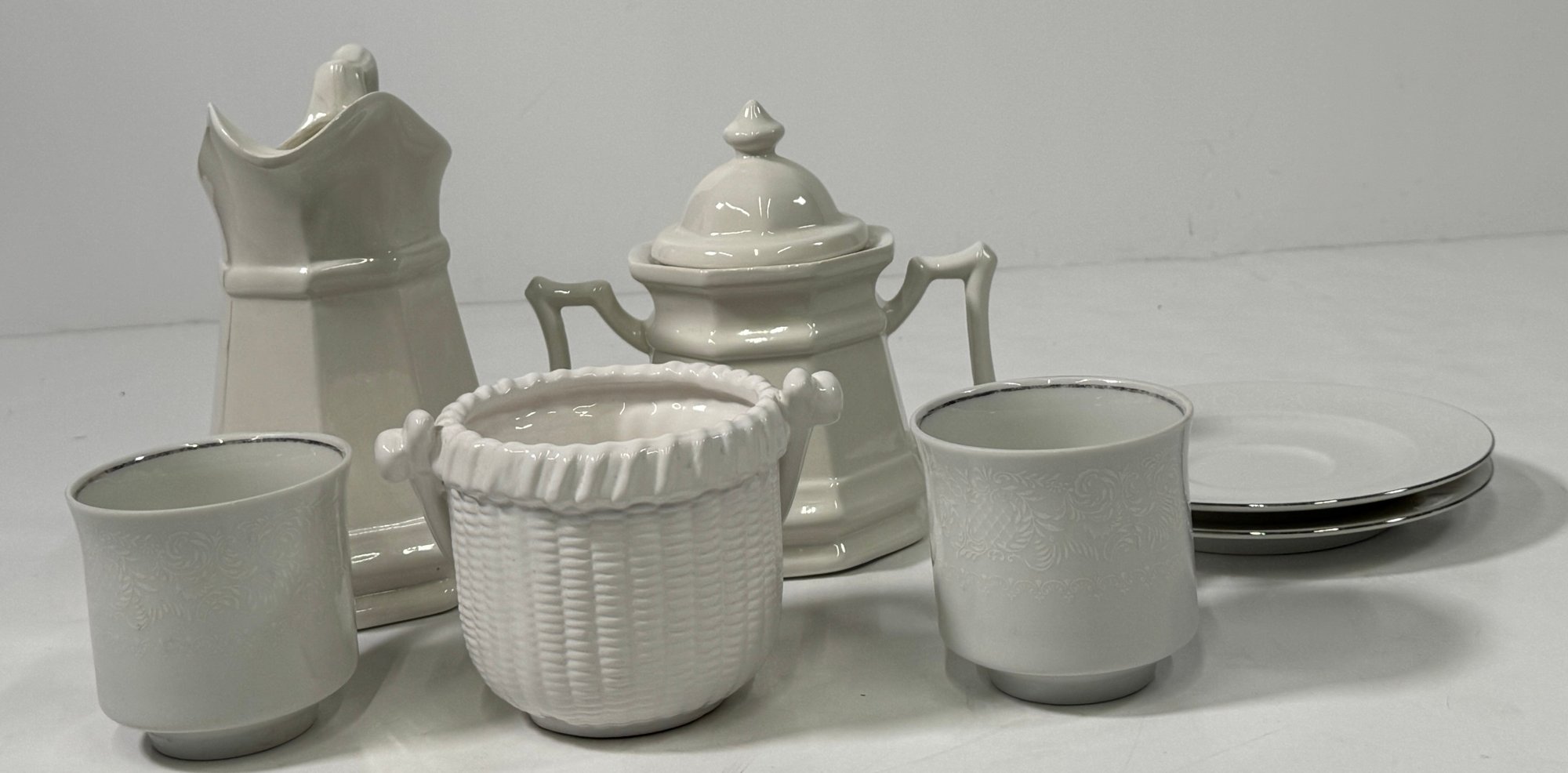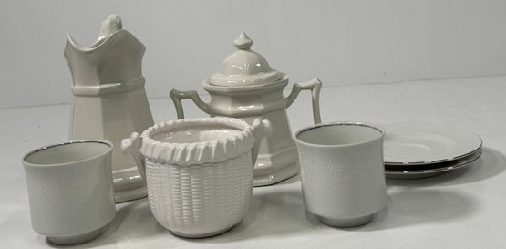 White ceramic tableware set. Includes a pitcher, sugar bowl with lid, two cups, two saucers, and a basket-shaped container. Pitcher is approximately 8'' tall.