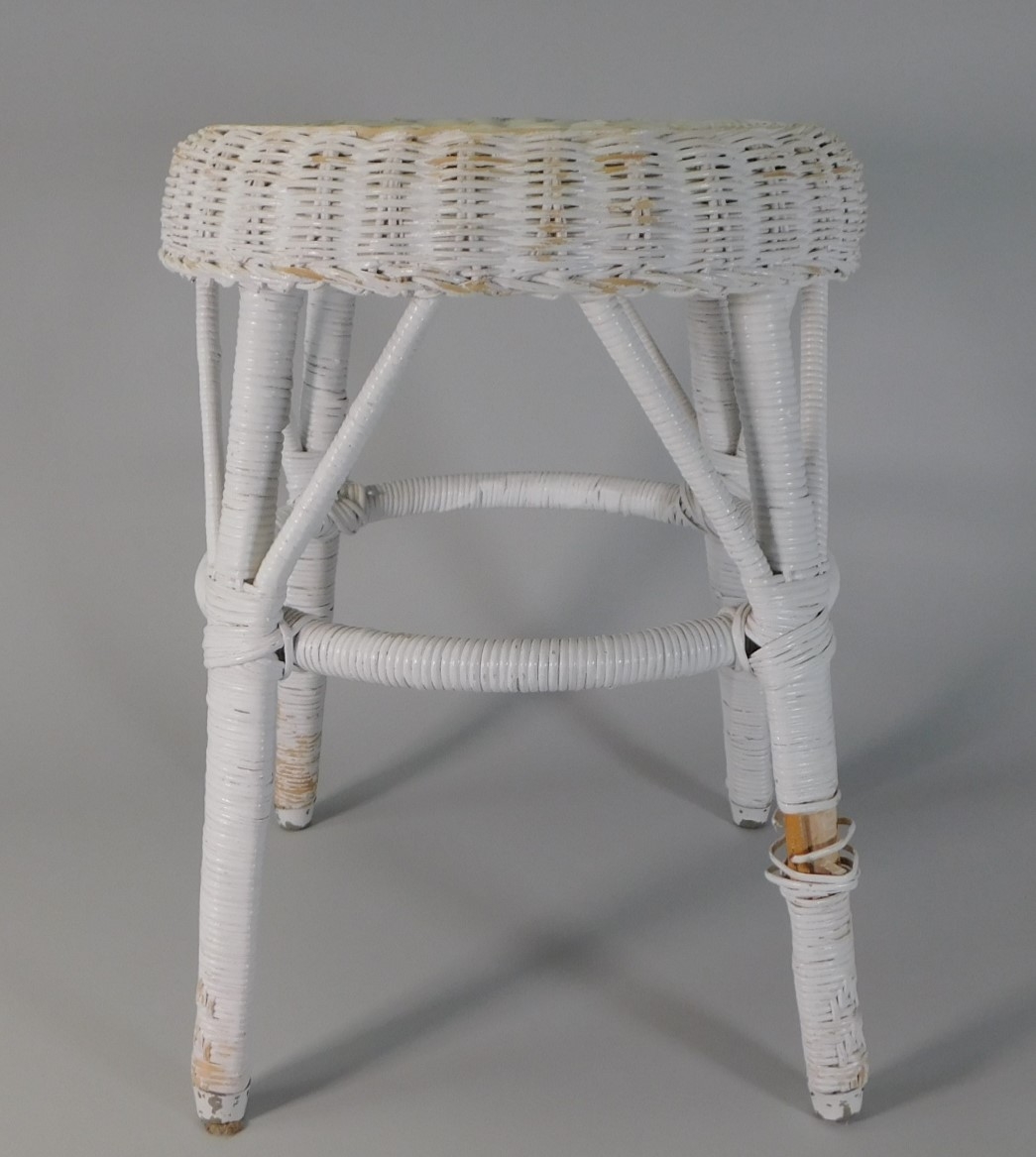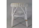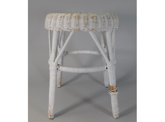 Sturdy, white wicker stool. Has some wear and tear, as shown.