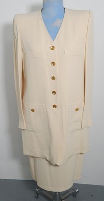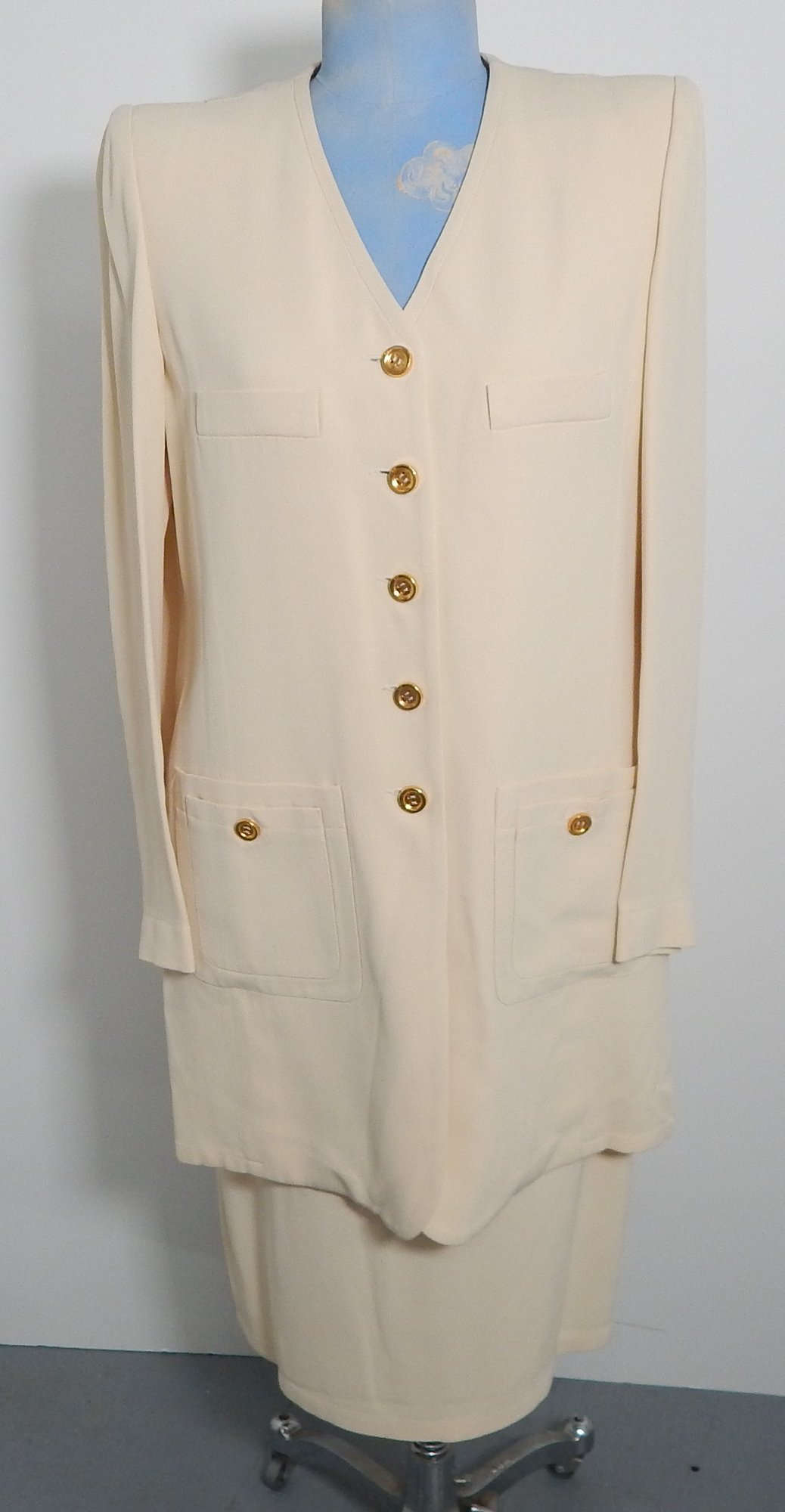 Ivory colored 2 piece set is made from 65% acetate and 35% rayon. It is dry clean only. Jacket is collarless and closes with 5 gold toned buttons. It has shoulder pads, a double slit in the back, and 3 buttons on each sleeve. Size is 42 in France which equals size 11 in the USA. Armpit to armpit is 20".Armpit to cuff is 17". From the top of the collar to the hem of the jacket is 32". Skirt zips and buttons on the side. Length of skirt is 24 3/8". There is a small mark on the skirt, as shown in the last photo. Otherwise, great condition. Shipping is available.