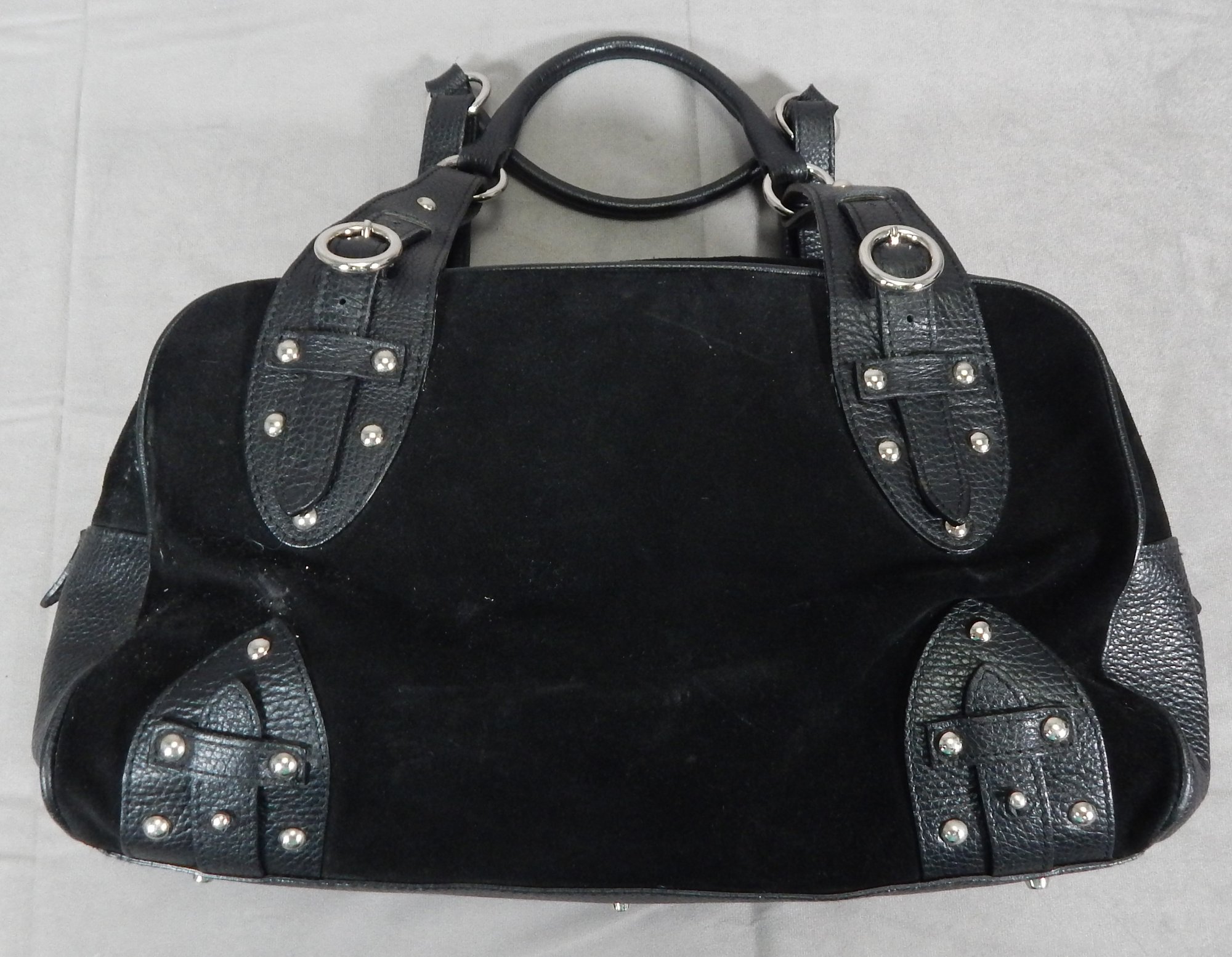 Made in Italy. Purse has leather handles with silver link and stud detail. Top zip closure with 2 zippers. Protective metal feet. Burgandy interior lining. Inside has a zip compartment and a small open pocket. 14" x 6 1/2" x 8" tall. Purse has been used, but overall good condition. Shipping is available.