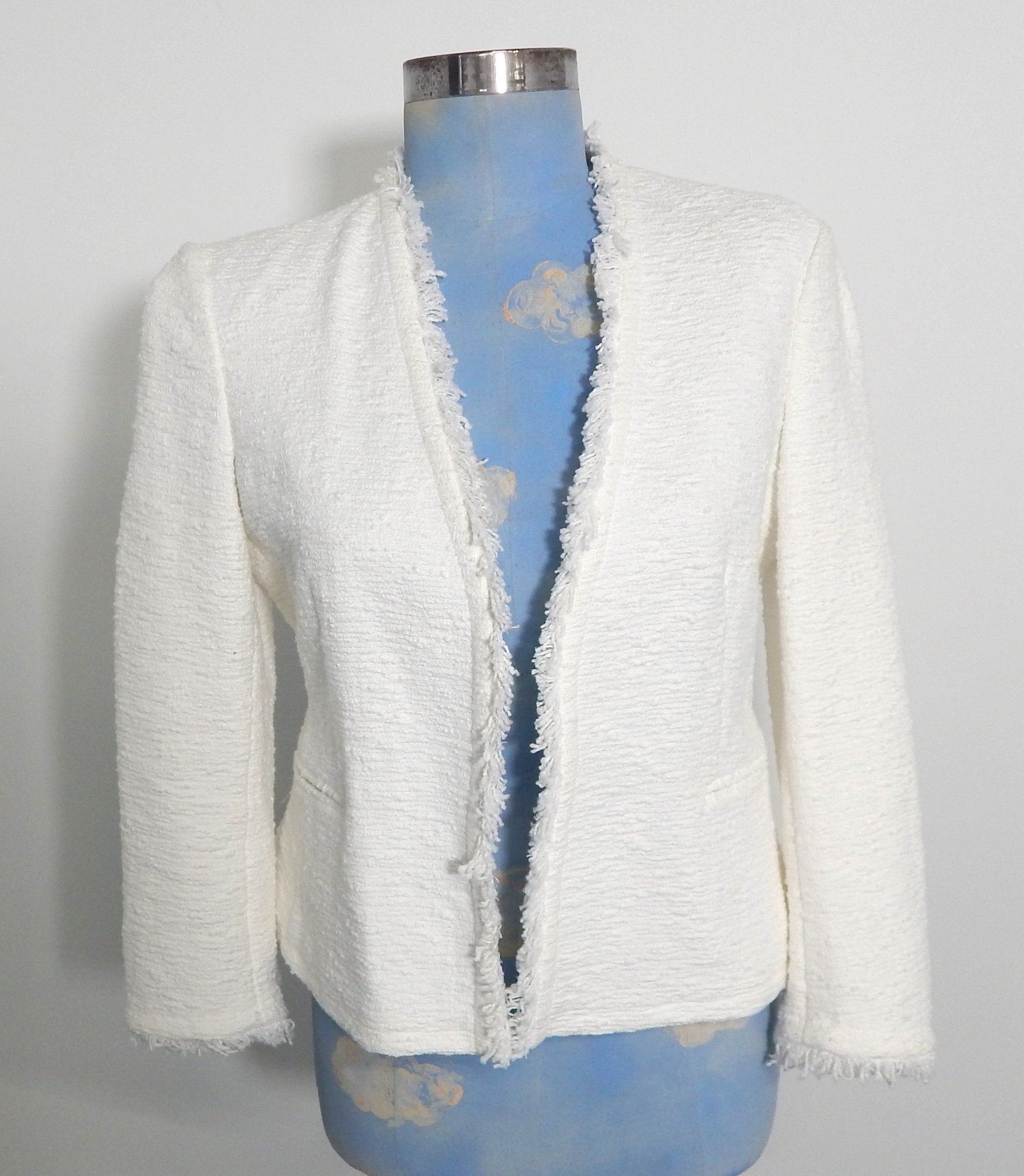 Jacket is white with fringe. 96% cotton. 4% polyamide. Dry clean only. The pockets are decoration only. Armpit to cuff is 13". Great condition. No rips or stains.