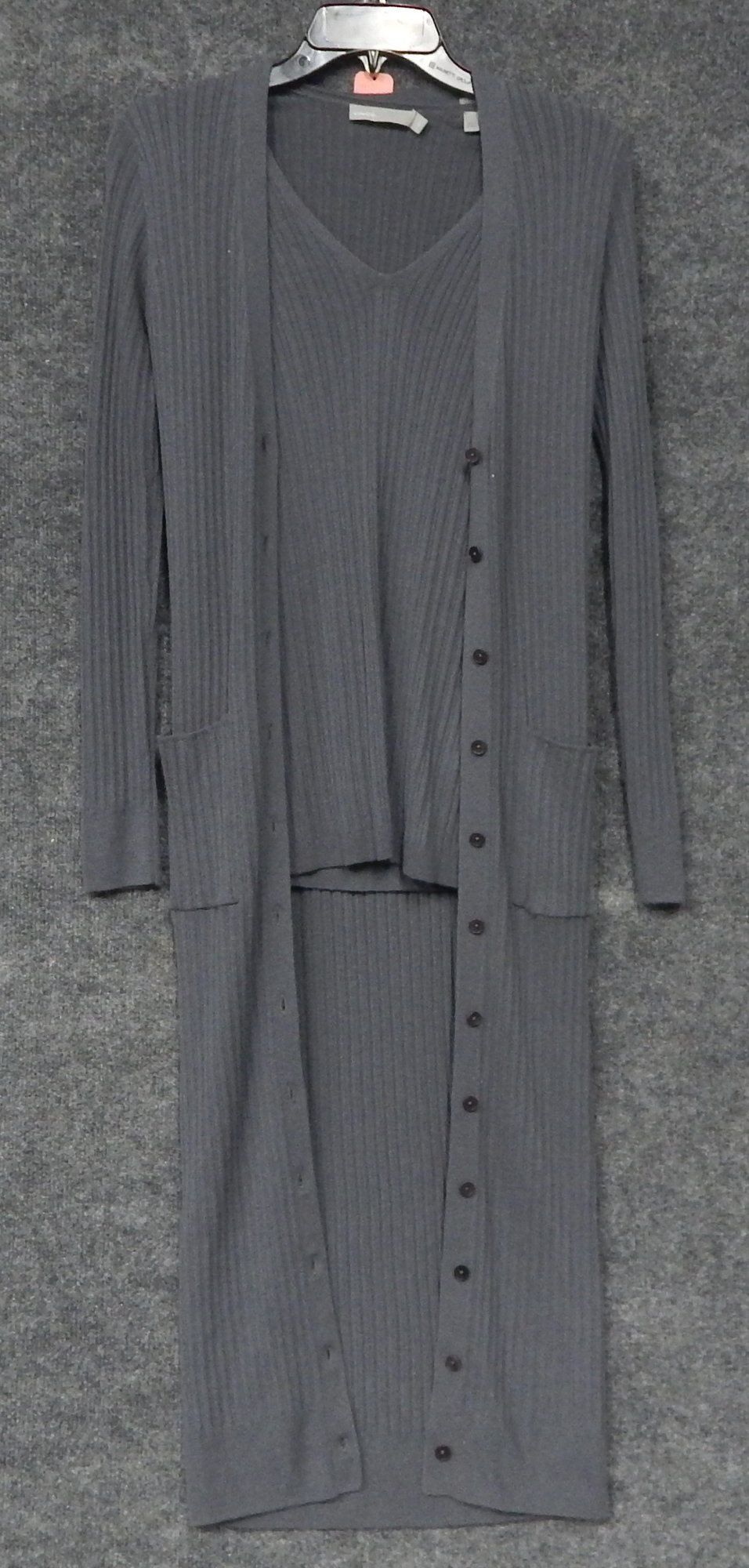Beautiful, soft cashmere sweater set made by vince. Size XS. Long sleeve sweater underneath. Very long cardigan over the top. It has a button-down front with 2 pockets and falls just above the ankle. Hand wash cold water or dry clean. Great condition. Shipping is available.