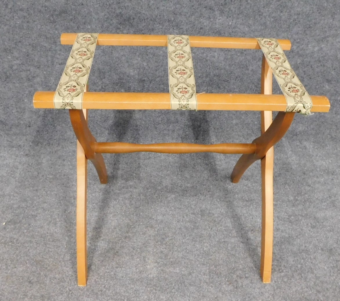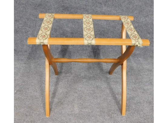Light colored wood with pretty embroidered straps. Folds up to keep out of the way.