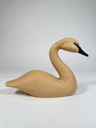 Wooden swan sculpture. The piece is light beige/natural wood tone with a black painted beak. Measures approximately 6.5" x 10" and weighs 15.6 oz. Features a detailed carving of the swan's body and neck.