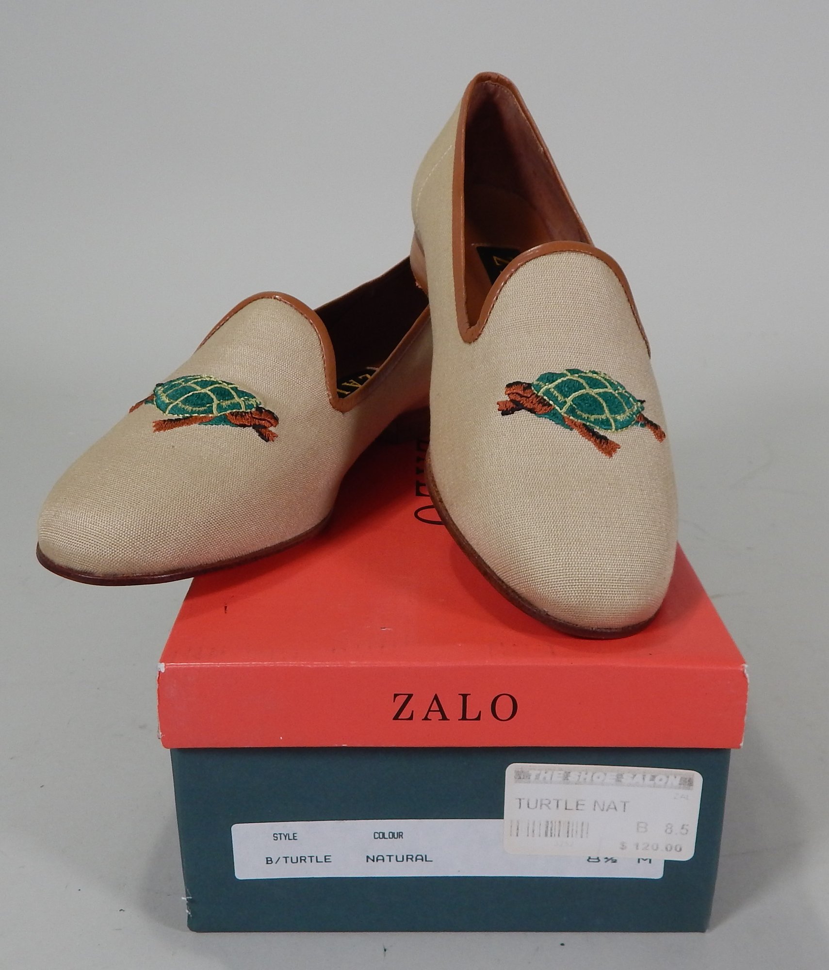 Brand new in the original box. Color is Natural with a fun turtle applique on the front. Leather sole. Handmade in Spain.