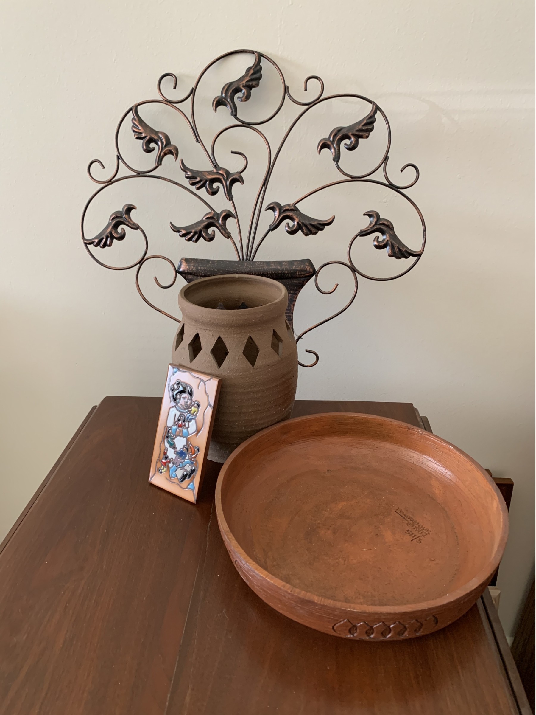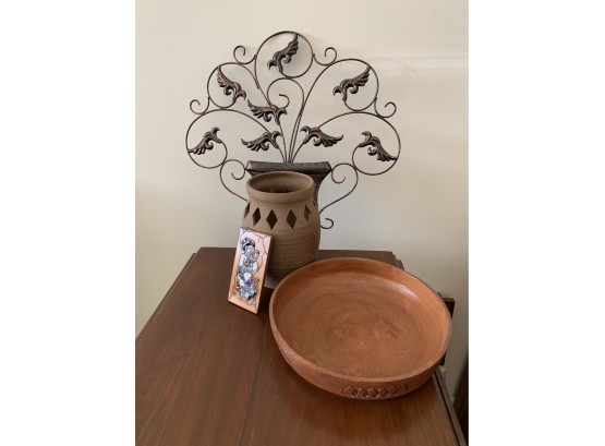 Metal Wall Hanging, Pottery, Southwest Tile, Wooden Bowl