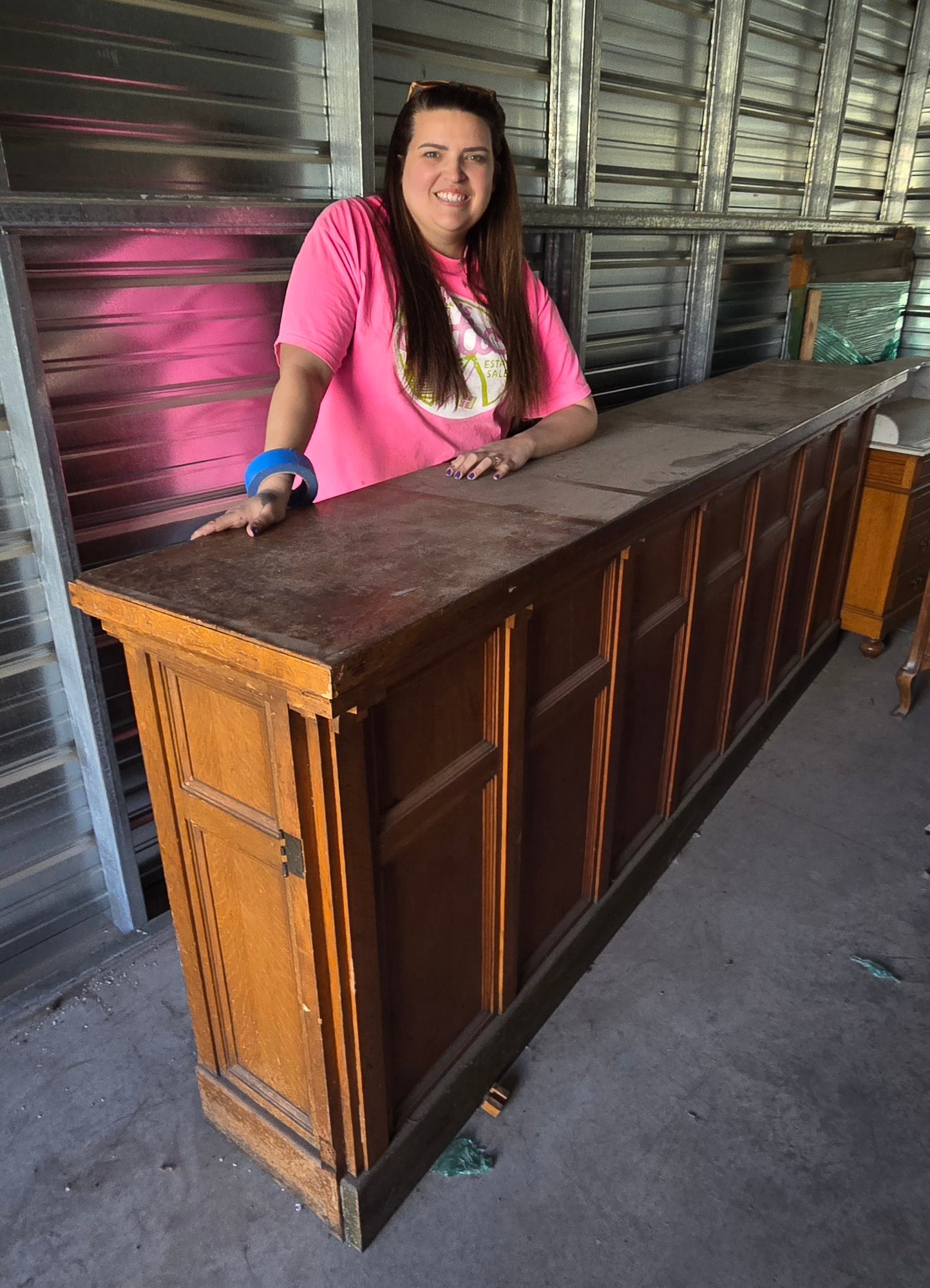 Truly amazing piece, you don't see these very often! One giant piece, with doors that slide nicely with shelves inside. Nice patina on the top.