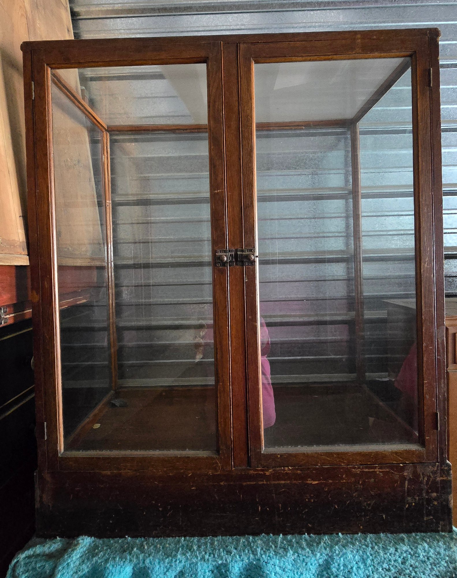Has glass on all sides. No shelves, but looks easy enough to add some. Great cabinet