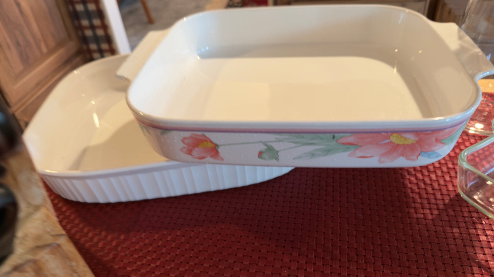 Rare corningware Pacifica pattern lasagna dish, french white lasagna dish and pyrex lasagna
