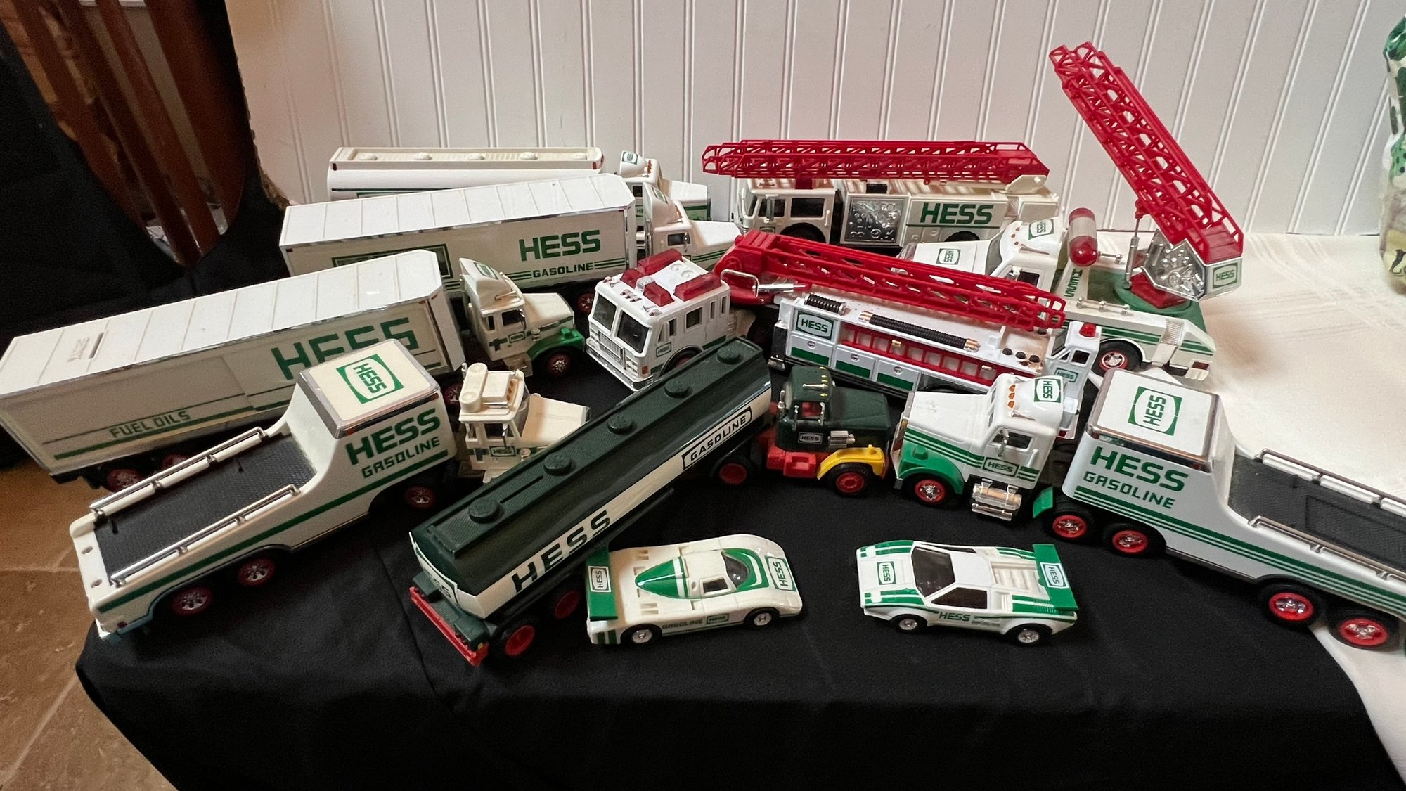 Hess toy trucks collection, featuring a variety of models including trailers, tankers, and more. Each piece captures the charm and detail that make Hess trucks a beloved collectible, perfect for enthusiasts and display alike.